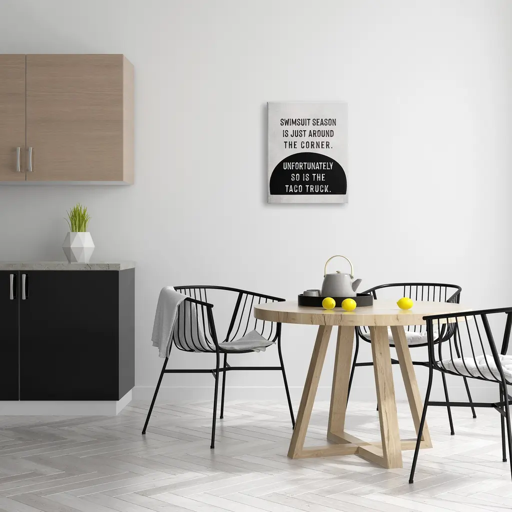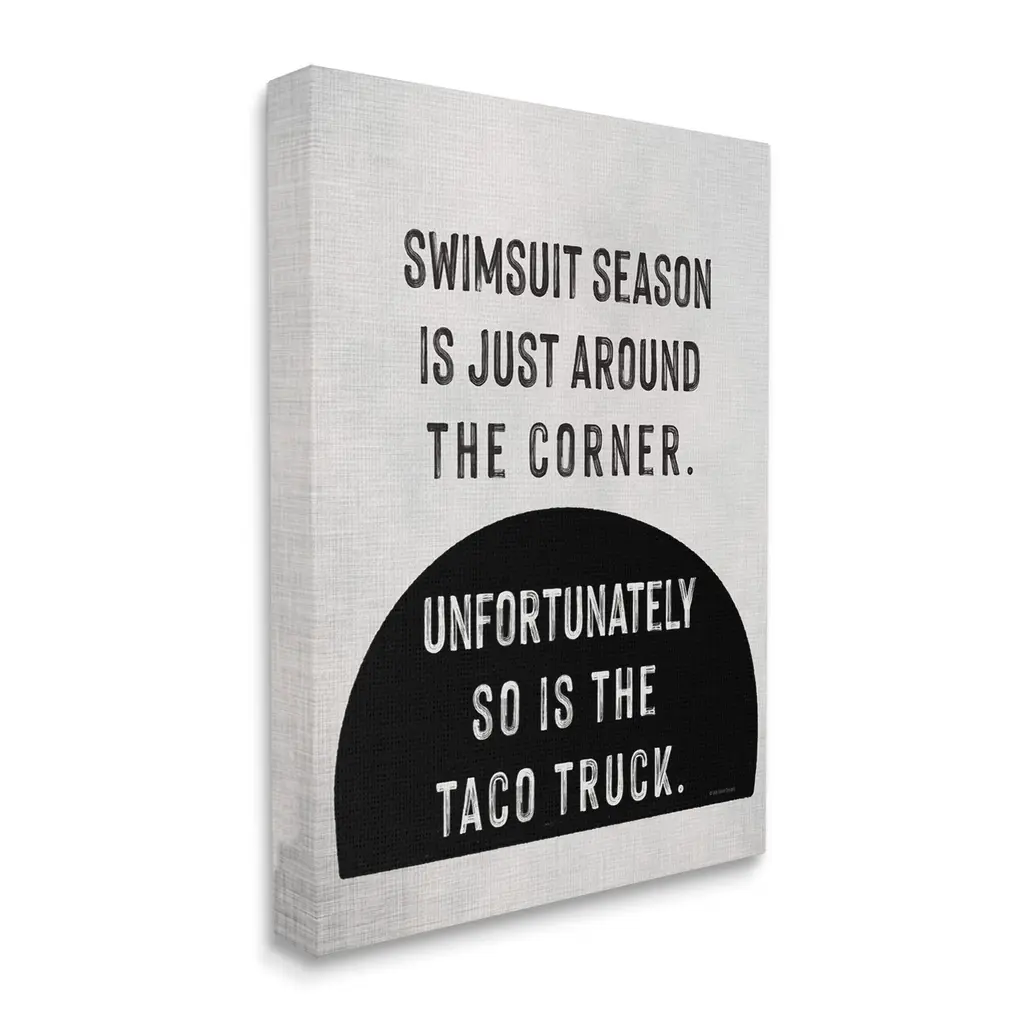 We create our stretched canvas to the highest standards. Using only the highest quality inks and canvas on Mimaki printers, we hand-cut and stretch each piece over a 1.5-inch thick wooden frame for hanging. As a result, the art comes ready to hang on the sturdy ledge with no installation required. Stupell Wall Art is made in the USA.Features: Dimensions: 16 x 1.5 x 20 InchesStretched Canvas Sizes Include Standard: 16 x 1.5 x 20 Large: 20 x 1.5 x 30 X-Large: 30 x 1.5 x 40 Oversized: 36 x 1.5 x 48Wall Art is Ready to Hang with Hardware Free Hanging. No installation required. For Easy Set Up Lean or Layer Artwork on Shelf or Against Wall.Our stretched canvas is created with the highest standards. We use only the highest quality inks and canvas on our in house Mimaki printers, and then hand cut and stretch each piece over a 1.5 inch thick wooden frame for hanging. Made In USA.Artwork Relates To: Humor, Funny, Food, Summer, Phrase, Swimsuit Season is Just Around the Corner. Unfortunately so is the Taco TruckDesign by Lady Louise Designs