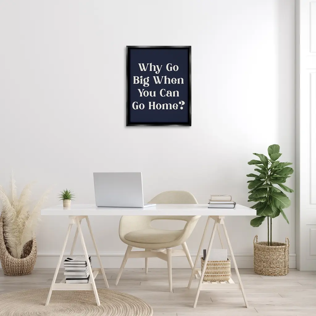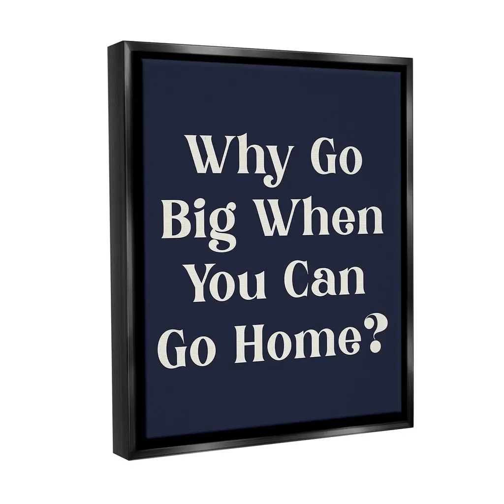 Elevate your home or office to the next level with Stupell Framed Floating Canvas Wall Art. Our premium hand-stretched canvas is mounted securely into a sturdy lightweight frame. The museum-style gap between the wrapped canvas and the box frame gives the illusion of floating artwork. Stupell Wall Art is made in the USA.Features: Dimensions: 17 x 1.7 x 21 Frame, 16 x 1.5 x 20 Canvas ArtFloating Frame Canvas Products are available in sizes 17"x21" and 25"x31". All Floating Frame Canvas Products have a 1.7" Depth.Wall Art is Ready to Hang with Hardware Free Hanging. No Installation required. For Easy Set Up Lean or Layer Artwork on Shelf or Against Wall. Artwork is Permently Fixed into the Frame.Our elevated 1.7" Thick Floating Frame is the perfect complement to our canvas style Wall Art. We use only the highest quality inks in house with industry leading printing solutions. Canvas is hand stretched over a durable wood foundation and then mounted securly into a Modern Box Frame. Made in the USA.Artwork Relates To: Phrase, Minimal, Introvert, Traditional, Humor, Why Go Big When You Can Go Home?Design by Lil' Rue