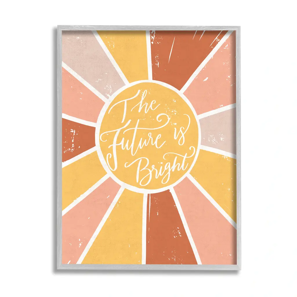 Add dimension to any room with our textured Framed Giclee Artwork. Our framed artwork is securely mounted into a 1.5-inch thick wood grain frame and ready to hang. Frames are available in three alluring styles: black, gray farmhouse and white. In addition, you should check out our oversized options if you want a statement piece. Stupell Wall Art is made in the USA.Features: Dimensions: 11 x 1.5 x 14 FramedFramed Giclee Sizes Include Standard: 11 x 1.5 x 14 Large: 16 x 1.5 x 20 Oversized: 24 x 1.5 x 30Wall Art is Ready to Hang - No Installation or Hardware Needed. For Easy Set Up Lean or Layer Artwork on Shelf or Against Wall.Our giclée prints are carefully mounted on a durable MDF backing, and then perfectly finished in a 1.5 inch thick woodgrain frame. Mounted frame colors include black, gray farmhouse and white. Made In USA.Artwork Relates To: Sun, Boho, Neutral, The Future Is BrightDesign by Caroline Alfreds