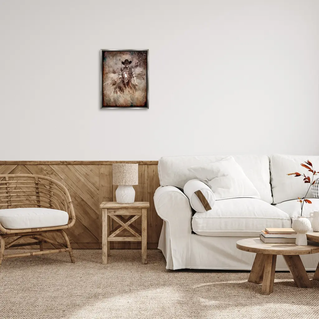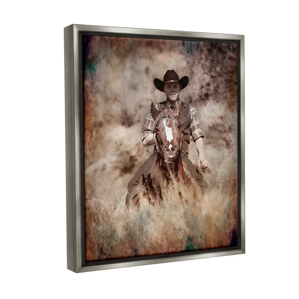 Elevate your home or office to the next level with Stupell Framed Floating Canvas Wall Art. Our premium hand-stretched canvas is mounted securely into a sturdy lightweight frame. The museum-style gap between the wrapped canvas and the box frame gives the illusion of floating artwork. Stupell Wall Art is made in the USA.Features: Dimensions: 17 x 1.7 x 21 Frame, 16 x 1.5 x 20 Canvas ArtFloating Frame Canvas Products are available in sizes 17"x21" and 25"x31". All Floating Frame Canvas Products have a 1.7" Depth.Wall Art is Ready to Hang with Hardware Free Hanging. No Installation required. For Easy Set Up Lean or Layer Artwork on Shelf or Against Wall. Artwork is Permently Fixed into the Frame.Our elevated 1.7" Thick Floating Frame is the perfect complement to our canvas style Wall Art. We use only the highest quality inks in house with industry leading printing solutions. Canvas is hand stretched over a durable wood foundation and then mounted securly into a Modern Box Frame. Made in the USA.Artwork Relates To: Animal, Horse, Mammal, Saddle, Equestrian, Person, Rodeo, Country, Southwestern, CowboyDesign by Jerry Cowart