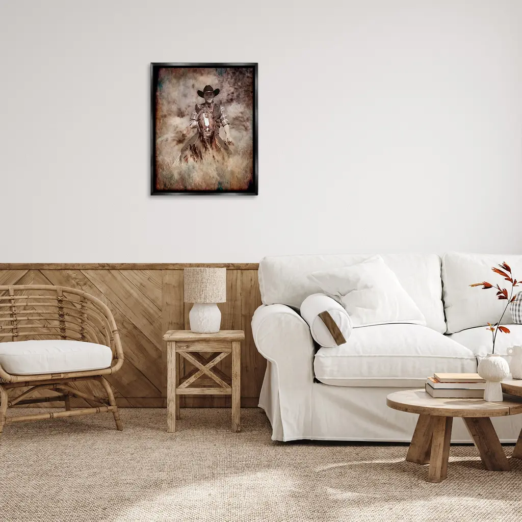 Elevate your home or office to the next level with Stupell Framed Floating Canvas Wall Art. Our premium hand-stretched canvas is mounted securely into a sturdy lightweight frame. The museum-style gap between the wrapped canvas and the box frame gives the illusion of floating artwork. Stupell Wall Art is made in the USA.Features: Dimensions: 17 x 1.7 x 21 Frame, 16 x 1.5 x 20 Canvas ArtFloating Frame Canvas Products are available in sizes 17"x21" and 25"x31". All Floating Frame Canvas Products have a 1.7" Depth.Wall Art is Ready to Hang with Hardware Free Hanging. No Installation required. For Easy Set Up Lean or Layer Artwork on Shelf or Against Wall. Artwork is Permently Fixed into the Frame.Our elevated 1.7" Thick Floating Frame is the perfect complement to our canvas style Wall Art. We use only the highest quality inks in house with industry leading printing solutions. Canvas is hand stretched over a durable wood foundation and then mounted securly into a Modern Box Frame. Made in the USA.Artwork Relates To: Animal, Horse, Mammal, Saddle, Equestrian, Person, Rodeo, Country, Southwestern, CowboyDesign by Jerry Cowart