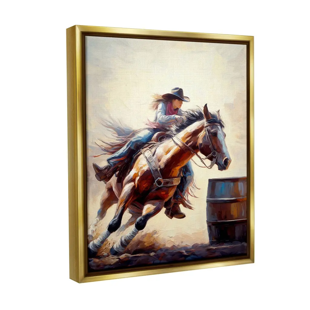 Elevate your home or office to the next level with Stupell Framed Floating Canvas Wall Art. Our premium hand-stretched canvas is mounted securely into a sturdy lightweight frame. The museum-style gap between the wrapped canvas and the box frame gives the illusion of floating artwork. Stupell Wall Art is made in the USA.Features: Dimensions: 17 x 1.7 x 21 Frame, 16 x 1.5 x 20 Canvas ArtFloating Frame Canvas Products are available in sizes 17"x21" and 25"x31". All Floating Frame Canvas Products have a 1.7" Depth.Wall Art is Ready to Hang with Hardware Free Hanging. No Installation required. For Easy Set Up Lean or Layer Artwork on Shelf or Against Wall. Artwork is Permently Fixed into the Frame.Our elevated 1.7" Thick Floating Frame is the perfect complement to our canvas style Wall Art. We use only the highest quality inks in house with industry leading printing solutions. Canvas is hand stretched over a durable wood foundation and then mounted securly into a Modern Box Frame. Made in the USA.Artwork Relates To: Equestrian, Rodeo, Country, Southwestern, Cowgirl, Animal, Horse, Racing, GallopingDesign by Ramona Murdock