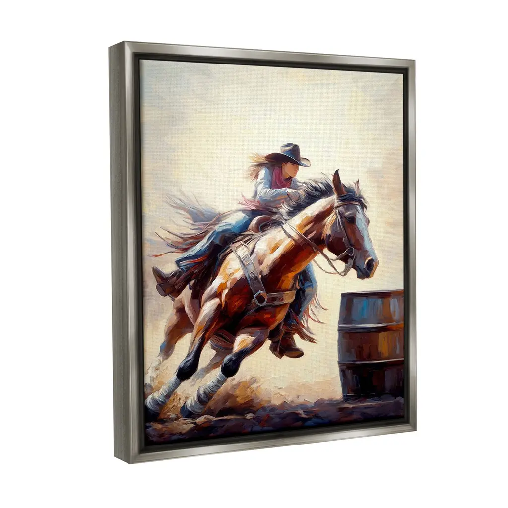 Elevate your home or office to the next level with Stupell Framed Floating Canvas Wall Art. Our premium hand-stretched canvas is mounted securely into a sturdy lightweight frame. The museum-style gap between the wrapped canvas and the box frame gives the illusion of floating artwork. Stupell Wall Art is made in the USA.Features: Dimensions: 17 x 1.7 x 21 Frame, 16 x 1.5 x 20 Canvas ArtFloating Frame Canvas Products are available in sizes 17"x21" and 25"x31". All Floating Frame Canvas Products have a 1.7" Depth.Wall Art is Ready to Hang with Hardware Free Hanging. No Installation required. For Easy Set Up Lean or Layer Artwork on Shelf or Against Wall. Artwork is Permently Fixed into the Frame.Our elevated 1.7" Thick Floating Frame is the perfect complement to our canvas style Wall Art. We use only the highest quality inks in house with industry leading printing solutions. Canvas is hand stretched over a durable wood foundation and then mounted securly into a Modern Box Frame. Made in the USA.Artwork Relates To: Equestrian, Rodeo, Country, Southwestern, Cowgirl, Animal, Horse, Racing, GallopingDesign by Ramona Murdock