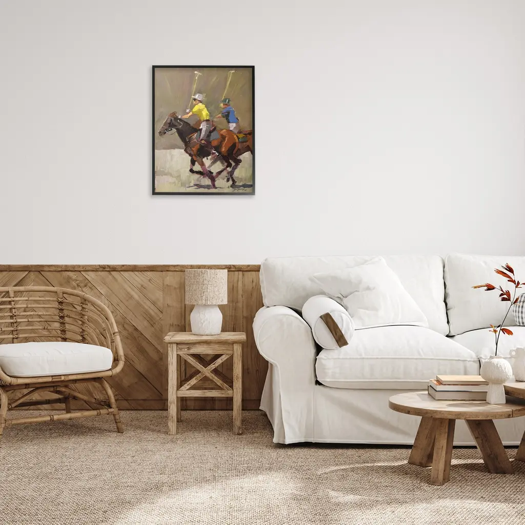 Add dimension to any room with our textured Framed Giclee Artwork. Our framed artwork is securely mounted into a 1.5-inch thick wood grain frame and ready to hang. Frames are available in three alluring styles: black, gray farmhouse and white. In addition, you should check out our oversized options if you want a statement piece. Stupell Wall Art is made in the USA.Features: Dimensions: 11 x 1.5 x 14 FramedFramed Giclee Products are available in the sizes 11"x14", 16"x20" or 24"x30". All Framed Giclee Products have a 1.5" Depth. Wall Art is Ready to Hang with Hardware Free Hanging. No installation required. For Easy Set Up Lean or Layer Artwork on Shelf or Against Wall.Our giclée prints are carefully mounted on a durable MDF backing, and then perfectly finished in a 1.5 inch thick woodgrain frame. Mounted frame colors include black, gray farmhouse and white. Made In USA.Artwork Relates To: Animal, Equestrian, Horse, Mammal, People, Person, Sport, Team, Team Sport, Polo, Helmet, Gallop, AbstractDesign by Jeri Ireland