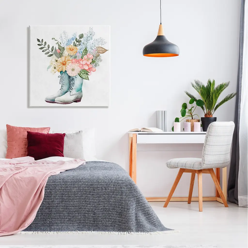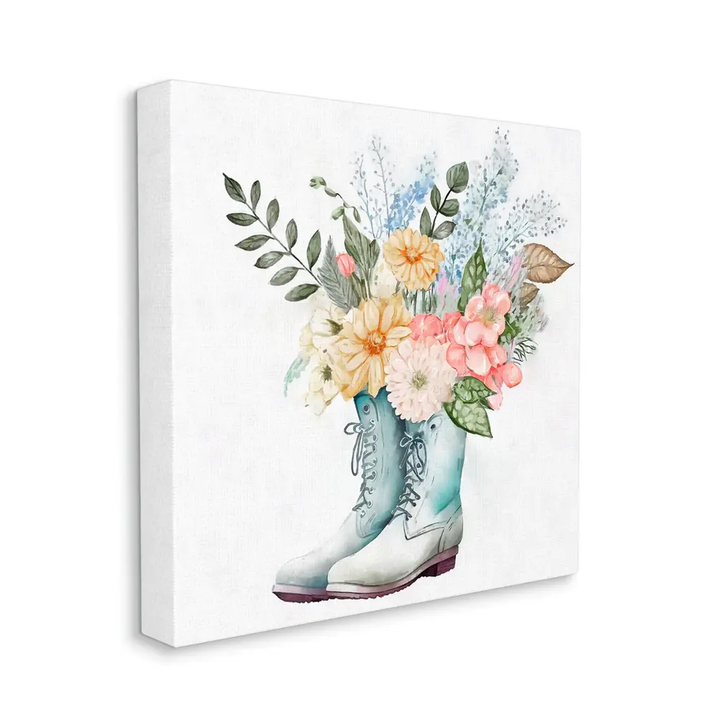 We create our stretched canvas to the highest standards. Using only the highest quality inks and canvas on Mimaki printers, we hand-cut and stretch each piece over a 1.5-inch thick wooden frame for hanging. As a result, the art comes ready to hang on the sturdy ledge with no installation required. Stupell Wall Art is made in the USA.Features: Dimensions: 17 x 1.5 x 17 InchesStretched Canvas Sizes Include Standard: 17 x 1.5 x 17 Large: 24 x 1.5 x 24 X-Large: 30 x 1.5 x 30 Oversized: 36 x 1.5 x 36Wall Art is Ready to Hang - No Installation or Hardware Needed. For Easy Set Up Lean or Layer Artwork on Shelf or Against Wall.Our stretched canvas is created with the highest standards. We use only the highest quality inks and canvas on our in house Mimaki printers, and then hand cut and stretch each piece over a 1.5 inch thick wooden frame for hanging. Made In USA.Artwork Relates To: Floral, Flower, Flower Arrangement, Flower Bouquet, Plant, Boot, GardeningDesign by Ziwei Li