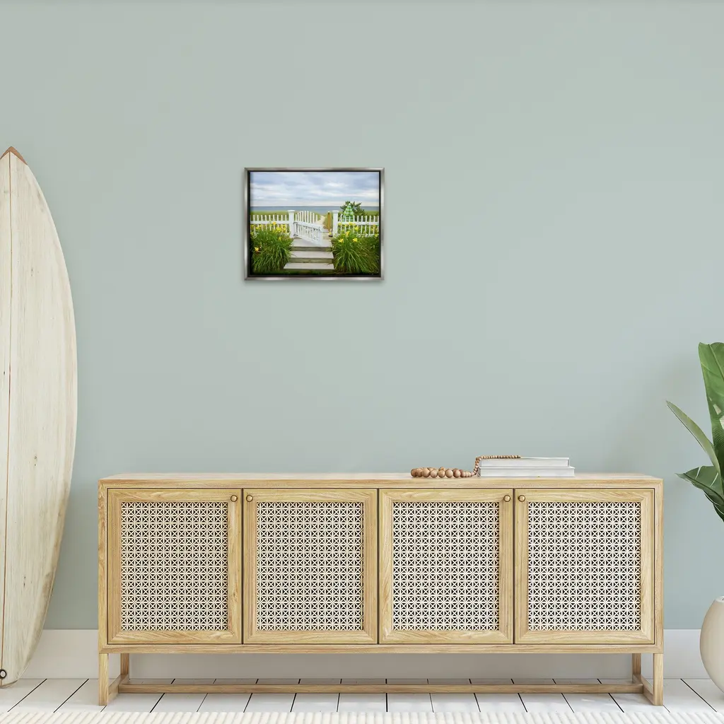 Elevate your home or office to the next level with Stupell Framed Floating Canvas Wall Art. Our premium hand-stretched canvas is mounted securely into a sturdy lightweight frame. The museum-style gap between the wrapped canvas and the box frame gives the illusion of floating artwork. Stupell Wall Art is made in the USA.Features: Dimensions: 21 x 1.7 x 17 Frame, 20 x 1.5 x 16 Canvas ArtFloating Frame Canvas Products are available in sizes 21"x17" and 31"x25". All Floating Frame Canvas Products have a 1.7" Depth.Wall Art is Ready to Hang with Hardware Free Hanging. No Installation required. For Easy Set Up Lean or Layer Artwork on Shelf or Against Wall. Artwork is Permently Fixed into the Frame.Our elevated 1.7" Thick Floating Frame is the perfect complement to our canvas style Wall Art. We use only the highest quality inks in house with industry leading printing solutions. Canvas is hand stretched over a durable wood foundation and then mounted securly into a Modern Box Frame. Made in the USA.Artwork Relates To: Beach, Ocean, Sea, Coast, Nautical, Fence, Gate, Flower, Floral, GardenDesign by GraffiTee Studios