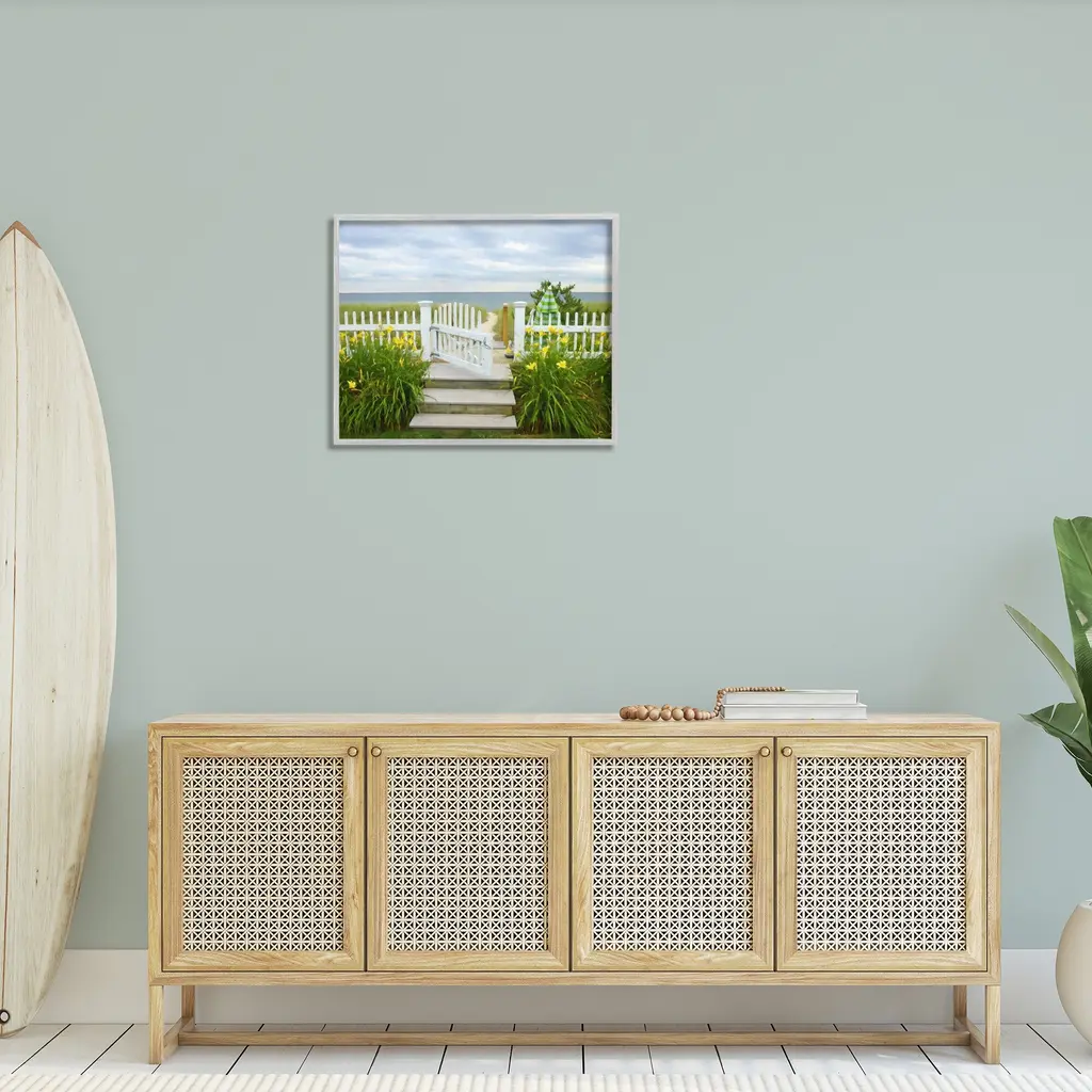 Add dimension to any room with our textured Framed Giclee Artwork. Our framed artwork is securely mounted into a 1.5-inch thick wood grain frame and ready to hang. Frames are available in three alluring styles: black, gray farmhouse and white. In addition, you should check out our oversized options if you want a statement piece. Stupell Wall Art is made in the USA.Features: Dimensions: 14 x 1.5 x 11 FramedFramed Giclee Products are available in the sizes 14"x11", 20"x16" or 30"x24". All Framed Giclee Products have a 1.5" Depth. Wall Art is Ready to Hang with Hardware Free Hanging. No installation required. For Easy Set Up Lean or Layer Artwork on Shelf or Against Wall.Our giclée prints are carefully mounted on a durable MDF backing, and then perfectly finished in a 1.5 inch thick woodgrain frame. Mounted frame colors include black, gray farmhouse and white. Made In USA.Artwork Relates To: Beach, Ocean, Sea, Coast, Nautical, Fence, Gate, Flower, Floral, GardenDesign by GraffiTee Studios