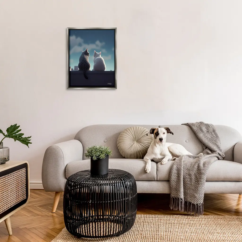 Elevate your home or office to the next level with Stupell Framed Floating Canvas Wall Art. Our premium hand-stretched canvas is mounted securely into a sturdy lightweight frame. The museum-style gap between the wrapped canvas and the box frame gives the illusion of floating artwork. Stupell Wall Art is made in the USA.Features: Dimensions: 17 x 1.7 x 21 Frame, 16 x 1.5 x 20 Canvas ArtFloating Frame Canvas Products are available in sizes 17"x21" and 25"x31". All Floating Frame Canvas Products have a 1.7" Depth.Wall Art is Ready to Hang with Hardware Free Hanging. No Installation required. For Easy Set Up Lean or Layer Artwork on Shelf or Against Wall. Artwork is Permently Fixed into the Frame.Our elevated 1.7" Thick Floating Frame is the perfect complement to our canvas style Wall Art. We use only the highest quality inks in house with industry leading printing solutions. Canvas is hand stretched over a durable wood foundation and then mounted securly into a Modern Box Frame. Made in the USA.Artwork Relates To: Animal, Cat, Mammal, Pet, Manx, Nature, Sky, Angora, CloudsDesign by RB