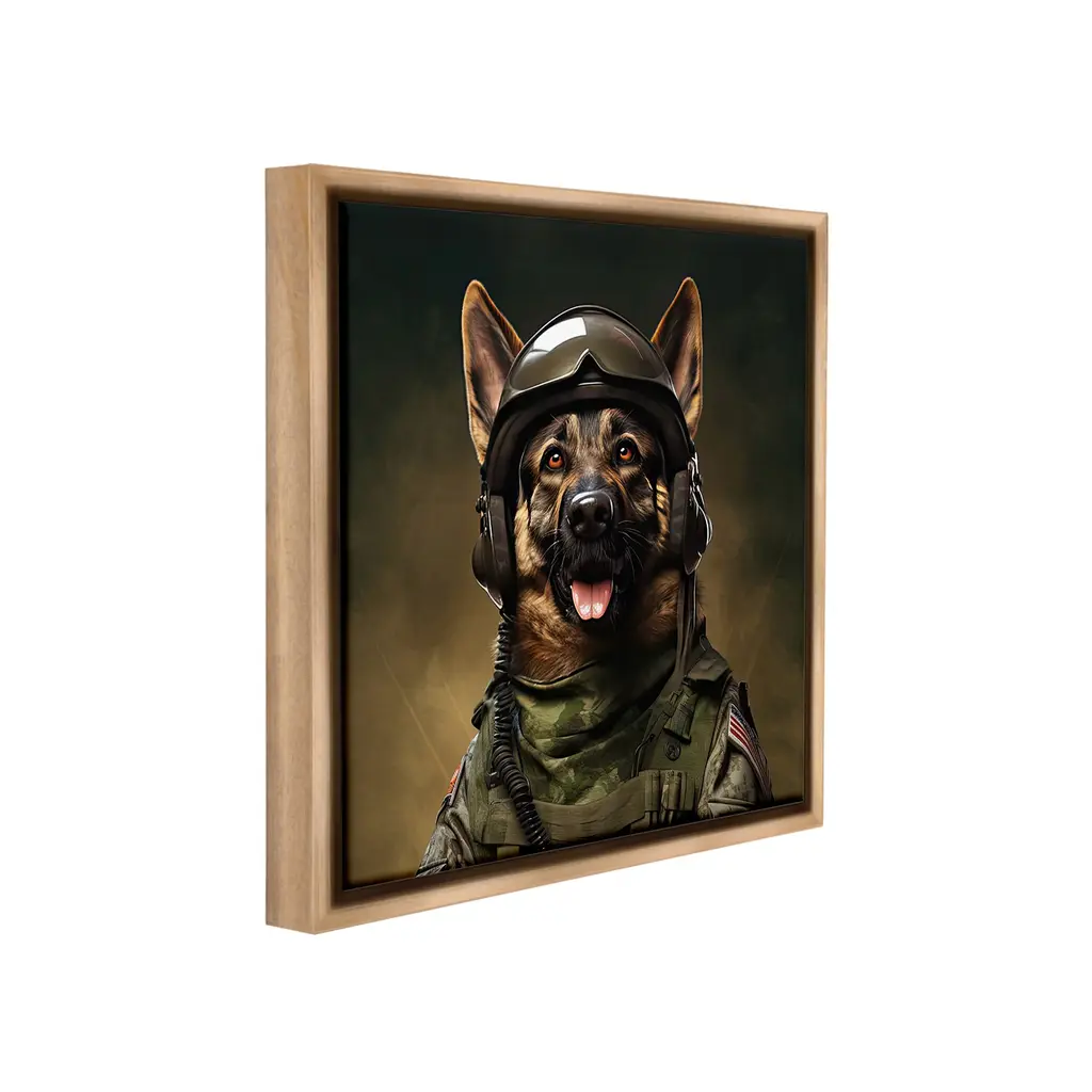 Elevate your home or office to the next level with Stupell Framed Floating Canvas Wall Art. Our premium hand-stretched canvas is mounted securely into a sturdy lightweight frame. The museum-style gap between the wrapped canvas and the box frame gives the illusion of floating artwork. Stupell Wall Art is made in the USA.Features: Dimensions: 18 x 1.7 x 18 Frame, 17 x 1.5 x 17 Canvas ArtFloating Frame Canvas Products are available in sizes 18"x18" and 25"x25". All Floating Frame Canvas Products have a 1.7" Depth.Wall Art is Ready to Hang with Hardware Free Hanging. No Installation required. For Easy Set Up Lean or Layer Artwork on Shelf or Against Wall. Artwork is Permently Fixed into the Frame.Our elevated 1.7" Thick Floating Frame is the perfect complement to our canvas style Wall Art. We use only the highest quality inks in house with industry leading printing solutions. Canvas is hand stretched over a durable wood foundation and then mounted securly into a Modern Box Frame. Made in the USA.Artwork Relates To: Animal, Canine, Dog, Mammal, Pet, Humor, Uniform, German ShepherdDesign by Jim Baldwin