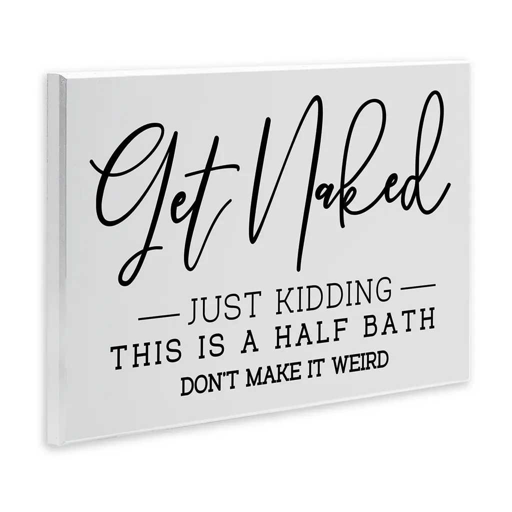 Our wall plaques start as high-quality lithograph prints mounted on durable 0.5-inch thick MDF wood. Each piece is hand finished and comes with a fresh layer of white foil on the sides to give it a crisp, clean look. Plaques arrive ready to hang without installation and come with removable plastic corners to keep them from damage in transit. Stupell Wall Art is made in the USA.Features: Dimensions: 15 x 0.5 x 10 InchesWall Plaque Sizes Include Standard: 15 x 0.5 x 10 Oversized: 19 x 0.5 x 13Wall Art is Ready to Hang with Hardware Free Hanging. No installation required. For Easy Set Up Lean or Layer Artwork on Shelf or Against Wall.All of our wall plaques start off as high quality lithograph prints that are then mounted on durable 0.5 inch thick MDF wood. Each piece is hand finished and comes with a fresh layer of foil on the sides to give it a crisp clean look. Made In USA.Artwork Relates To: Phrase, Vintage, Bathroom, Rules, Humor, Get Naked Just Kidding This is a Half Bath Don't Make it WeirdDesign by LSR Design Studio