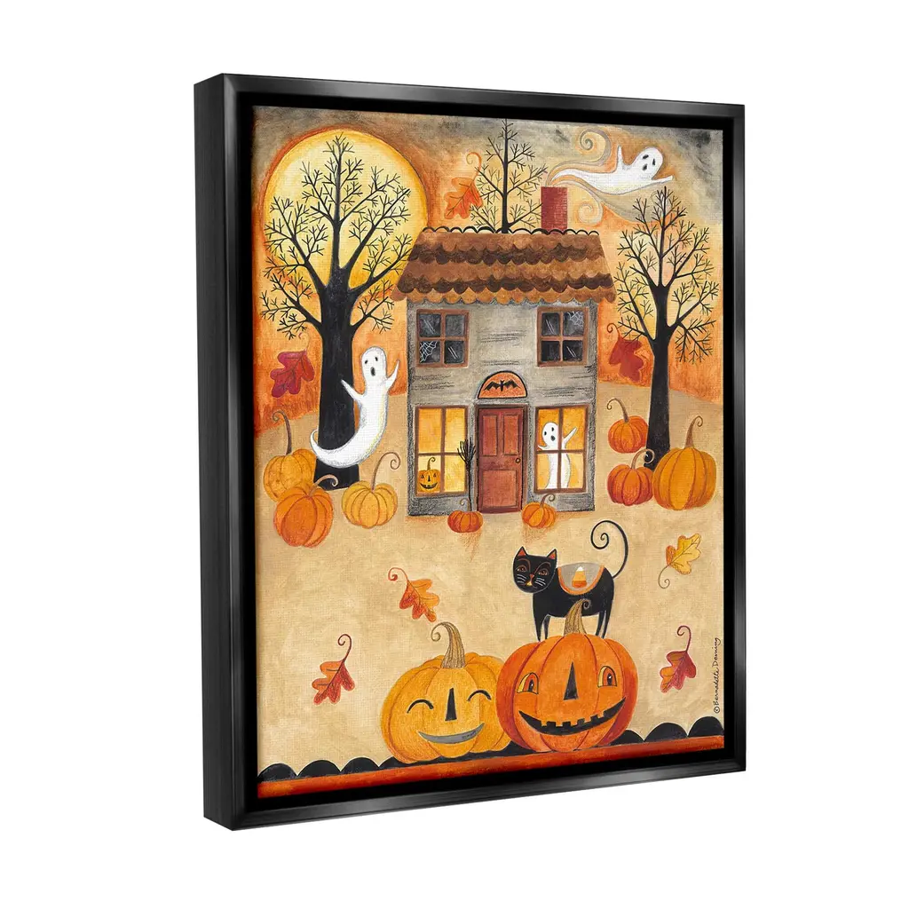 Elevate your home or office to the next level with Stupell Framed Floating Canvas Wall Art. Our premium hand-stretched canvas is mounted securely into a sturdy lightweight frame. The museum-style gap between the wrapped canvas and the box frame gives the illusion of floating artwork. Stupell Wall Art is made in the USA.Features: Dimensions: 17 x 1.7 x 21 Frame, 16 x 1.5 x 20 Canvas ArtFloating Frame Canvas Products are available in sizes 17"x21" and 25"x31". All Floating Frame Canvas Products have a 1.7" Depth.Wall Art is Ready to Hang with Hardware Free Hanging. No Installation required. For Easy Set Up Lean or Layer Artwork on Shelf or Against Wall. Artwork is Permently Fixed into the Frame.Our elevated 1.7" Thick Floating Frame is the perfect complement to our canvas style Wall Art. We use only the highest quality inks in house with industry leading printing solutions. Canvas is hand stretched over a durable wood foundation and then mounted securly into a Modern Box Frame. Made in the USA.Artwork Relates To: Festival, Halloween, Jack-o-Lantern, Ghost, Whimsical, Fall, Autumn, House, Shop, Landscape, Pumpkin, Moon, Cat, LeafDesign by Bernadette Deming
