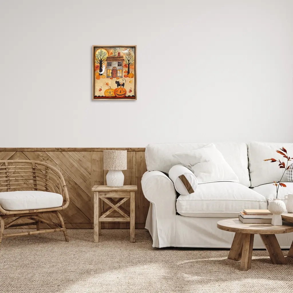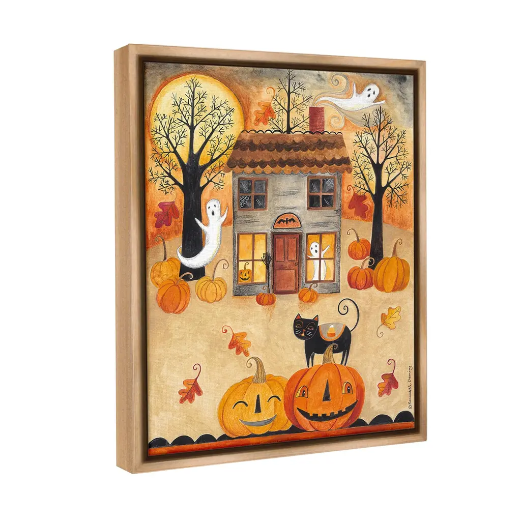 Elevate your home or office to the next level with Stupell Framed Floating Canvas Wall Art. Our premium hand-stretched canvas is mounted securely into a sturdy lightweight frame. The museum-style gap between the wrapped canvas and the box frame gives the illusion of floating artwork. Stupell Wall Art is made in the USA.Features: Dimensions: 17 x 1.7 x 21 Frame, 16 x 1.5 x 20 Canvas ArtFloating Frame Canvas Products are available in sizes 17"x21" and 25"x31". All Floating Frame Canvas Products have a 1.7" Depth.Wall Art is Ready to Hang with Hardware Free Hanging. No Installation required. For Easy Set Up Lean or Layer Artwork on Shelf or Against Wall. Artwork is Permently Fixed into the Frame.Our elevated 1.7" Thick Floating Frame is the perfect complement to our canvas style Wall Art. We use only the highest quality inks in house with industry leading printing solutions. Canvas is hand stretched over a durable wood foundation and then mounted securly into a Modern Box Frame. Made in the USA.Artwork Relates To: Festival, Halloween, Jack-o-Lantern, Ghost, Whimsical, Fall, Autumn, House, Shop, Landscape, Pumpkin, Moon, Cat, LeafDesign by Bernadette Deming