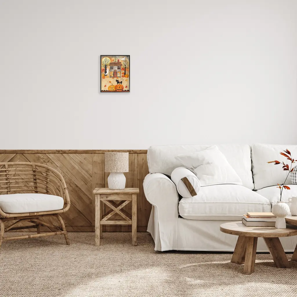 Add dimension to any room with our textured Framed Giclee Artwork. Our framed artwork is securely mounted into a 1.5-inch thick wood grain frame and ready to hang. Frames are available in three alluring styles: black, gray farmhouse and white. In addition, you should check out our oversized options if you want a statement piece. Stupell Wall Art is made in the USA.Features: Dimensions: 11 x 1.5 x 14 FramedFramed Giclee Products are available in the sizes 11"x14", 16"x20" or 24"x30". All Framed Giclee Products have a 1.5" Depth. Wall Art is Ready to Hang with Hardware Free Hanging. No installation required. For Easy Set Up Lean or Layer Artwork on Shelf or Against Wall.Our giclée prints are carefully mounted on a durable MDF backing, and then perfectly finished in a 1.5 inch thick woodgrain frame. Mounted frame colors include black, gray farmhouse and white. Made In USA.Artwork Relates To: Festival, Halloween, Jack-o-Lantern, Ghost, Whimsical, Fall, Autumn, House, Shop, Landscape, Pumpkin, Moon, Cat, LeafDesign by Bernadette Deming
