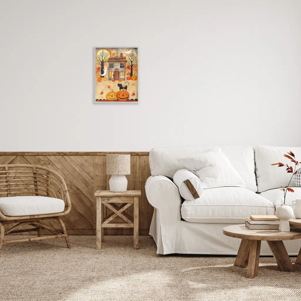 Add dimension to any room with our textured Framed Giclee Artwork. Our framed artwork is securely mounted into a 1.5-inch thick wood grain frame and ready to hang. Frames are available in three alluring styles: black, gray farmhouse and white. In addition, you should check out our oversized options if you want a statement piece. Stupell Wall Art is made in the USA.Features: Dimensions: 11 x 1.5 x 14 FramedFramed Giclee Products are available in the sizes 11"x14", 16"x20" or 24"x30". All Framed Giclee Products have a 1.5" Depth. Wall Art is Ready to Hang with Hardware Free Hanging. No installation required. For Easy Set Up Lean or Layer Artwork on Shelf or Against Wall.Our giclée prints are carefully mounted on a durable MDF backing, and then perfectly finished in a 1.5 inch thick woodgrain frame. Mounted frame colors include black, gray farmhouse and white. Made In USA.Artwork Relates To: Festival, Halloween, Jack-o-Lantern, Ghost, Whimsical, Fall, Autumn, House, Shop, Landscape, Pumpkin, Moon, Cat, LeafDesign by Bernadette Deming