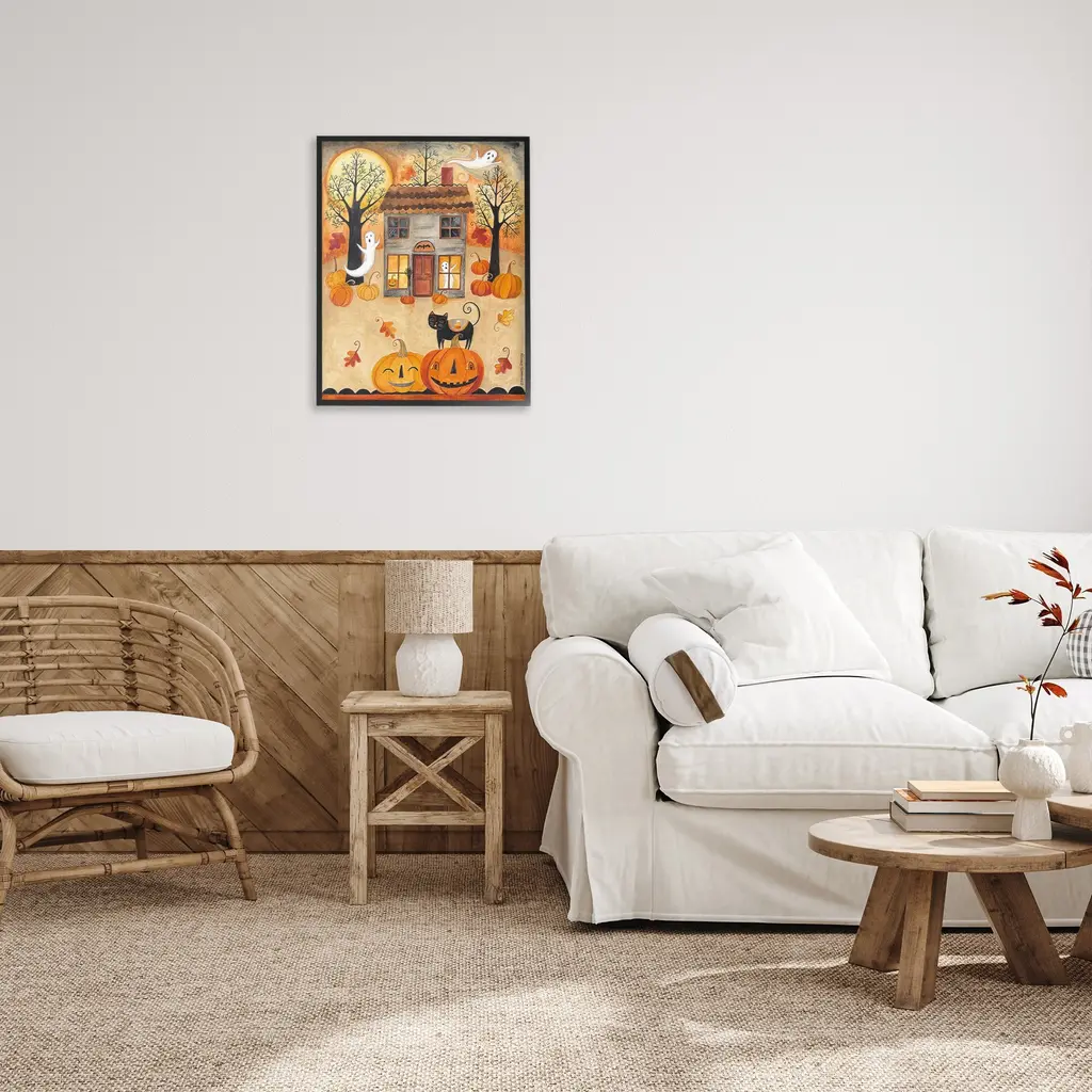 Add dimension to any room with our textured Framed Giclee Artwork. Our framed artwork is securely mounted into a 1.5-inch thick wood grain frame and ready to hang. Frames are available in three alluring styles: black, gray farmhouse and white. In addition, you should check out our oversized options if you want a statement piece. Stupell Wall Art is made in the USA.Features: Dimensions: 11 x 1.5 x 14 FramedFramed Giclee Products are available in the sizes 11"x14", 16"x20" or 24"x30". All Framed Giclee Products have a 1.5" Depth. Wall Art is Ready to Hang with Hardware Free Hanging. No installation required. For Easy Set Up Lean or Layer Artwork on Shelf or Against Wall.Our giclée prints are carefully mounted on a durable MDF backing, and then perfectly finished in a 1.5 inch thick woodgrain frame. Mounted frame colors include black, gray farmhouse and white. Made In USA.Artwork Relates To: Festival, Halloween, Jack-o-Lantern, Ghost, Whimsical, Fall, Autumn, House, Shop, Landscape, Pumpkin, Moon, Cat, LeafDesign by Bernadette Deming