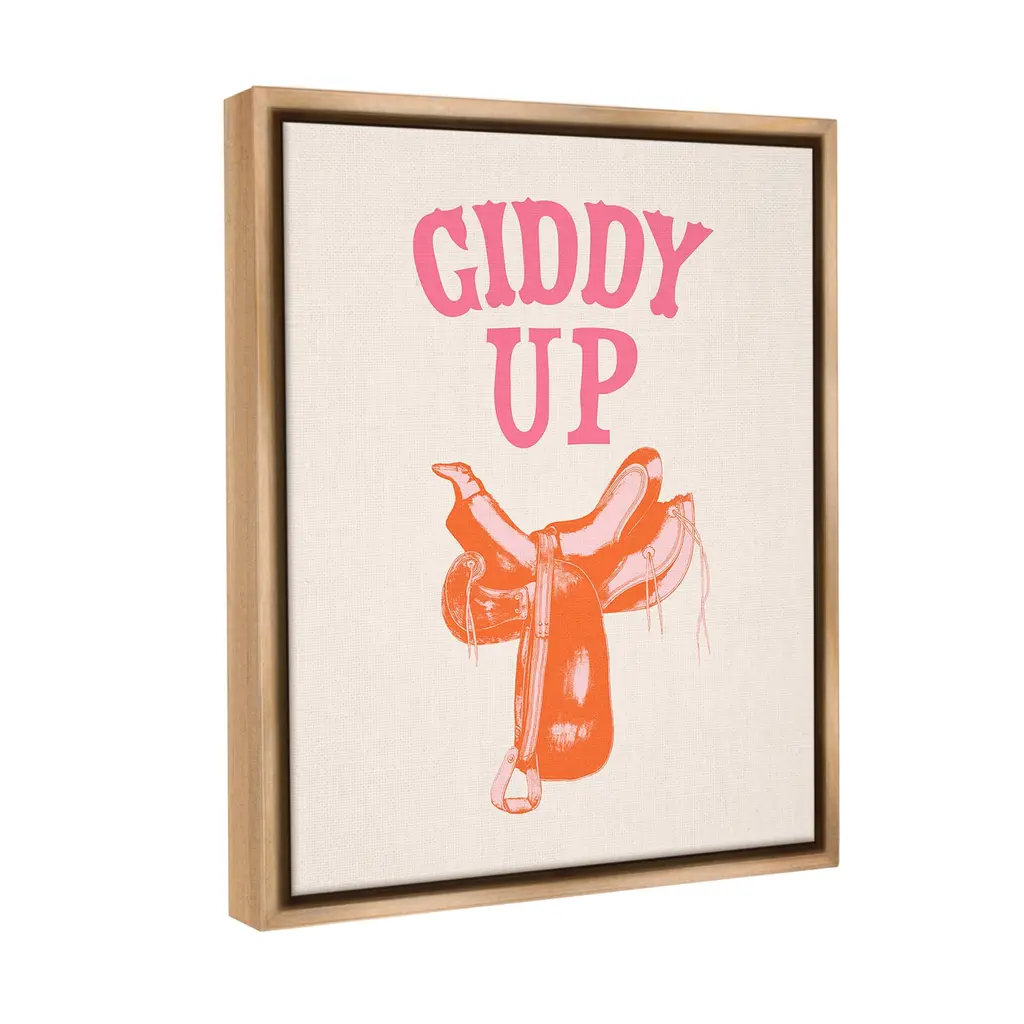 Elevate your home or office to the next level with Stupell Framed Floating Canvas Wall Art. Our premium hand-stretched canvas is mounted securely into a sturdy lightweight frame. The museum-style gap between the wrapped canvas and the box frame gives the illusion of floating artwork. Stupell Wall Art is made in the USA.Features: Dimensions: 17 x 1.7 x 21 Frame, 16 x 1.5 x 20 Canvas ArtFloating Frame Canvas Products are available in sizes 17"x21" and 25"x31". All Floating Frame Canvas Products have a 1.7" Depth.Wall Art is Ready to Hang with Hardware Free Hanging. No Installation required. For Easy Set Up Lean or Layer Artwork on Shelf or Against Wall. Artwork is Permently Fixed into the Frame.Our elevated 1.7" Thick Floating Frame is the perfect complement to our canvas style Wall Art. We use only the highest quality inks in house with industry leading printing solutions. Canvas is hand stretched over a durable wood foundation and then mounted securly into a Modern Box Frame. Made in the USA.Artwork Relates To: Animal, Horse, Mammal, Saddle, Equestrian, Rodeo, Country, Southwestern, Cowboy, Cowgirl, Phrase, Humor, Giddy UpDesign by Victoria Barnes