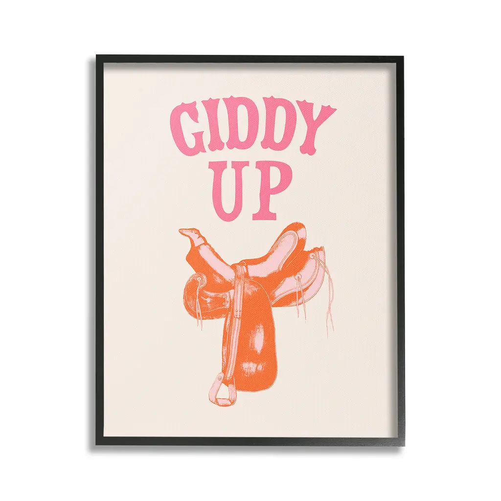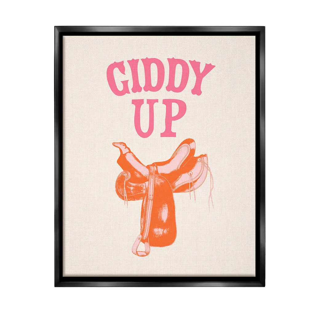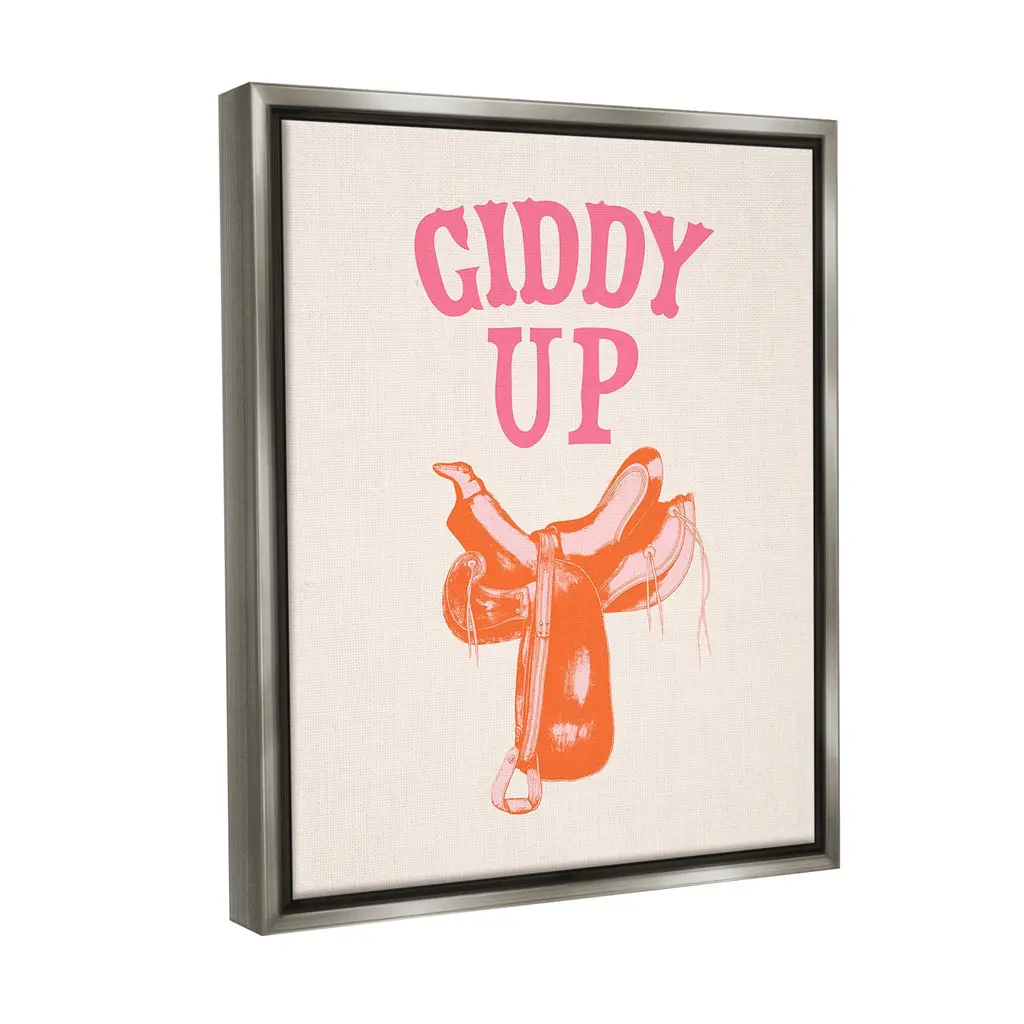 Elevate your home or office to the next level with Stupell Framed Floating Canvas Wall Art. Our premium hand-stretched canvas is mounted securely into a sturdy lightweight frame. The museum-style gap between the wrapped canvas and the box frame gives the illusion of floating artwork. Stupell Wall Art is made in the USA.Features: Dimensions: 17 x 1.7 x 21 Frame, 16 x 1.5 x 20 Canvas ArtFloating Frame Canvas Products are available in sizes 17"x21" and 25"x31". All Floating Frame Canvas Products have a 1.7" Depth.Wall Art is Ready to Hang with Hardware Free Hanging. No Installation required. For Easy Set Up Lean or Layer Artwork on Shelf or Against Wall. Artwork is Permently Fixed into the Frame.Our elevated 1.7" Thick Floating Frame is the perfect complement to our canvas style Wall Art. We use only the highest quality inks in house with industry leading printing solutions. Canvas is hand stretched over a durable wood foundation and then mounted securly into a Modern Box Frame. Made in the USA.Artwork Relates To: Animal, Horse, Mammal, Saddle, Equestrian, Rodeo, Country, Southwestern, Cowboy, Cowgirl, Phrase, Humor, Giddy UpDesign by Victoria Barnes