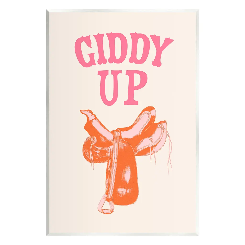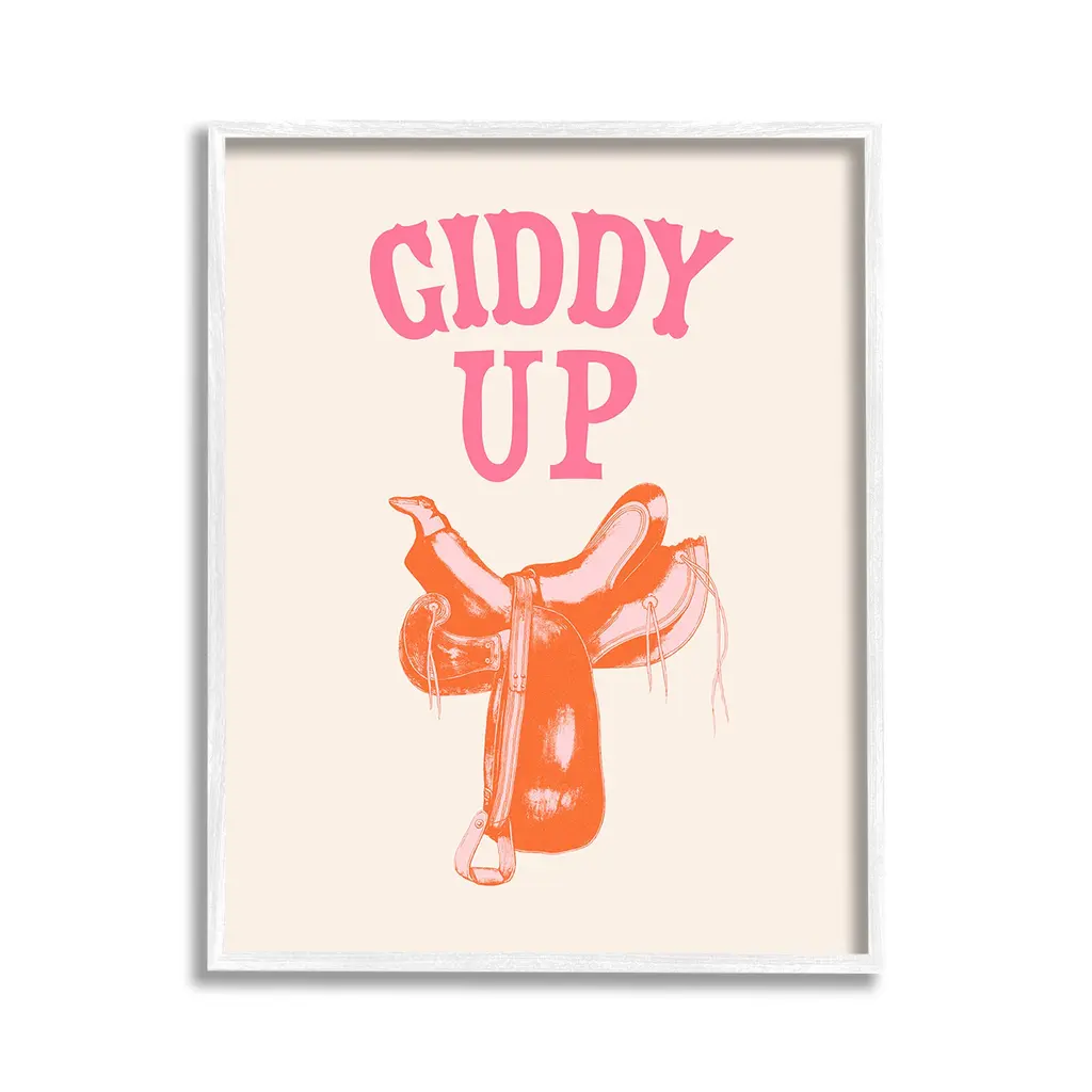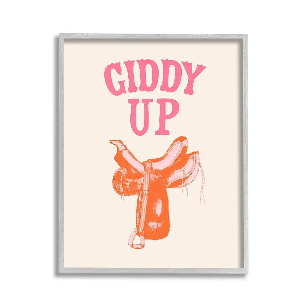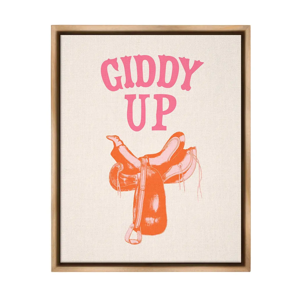 Elevate your home or office to the next level with Stupell Framed Floating Canvas Wall Art. Our premium hand-stretched canvas is mounted securely into a sturdy lightweight frame. The museum-style gap between the wrapped canvas and the box frame gives the illusion of floating artwork. Stupell Wall Art is made in the USA.Features: Dimensions: 17 x 1.7 x 21 Frame, 16 x 1.5 x 20 Canvas ArtFloating Frame Canvas Products are available in sizes 17"x21" and 25"x31". All Floating Frame Canvas Products have a 1.7" Depth.Wall Art is Ready to Hang with Hardware Free Hanging. No Installation required. For Easy Set Up Lean or Layer Artwork on Shelf or Against Wall. Artwork is Permently Fixed into the Frame.Our elevated 1.7" Thick Floating Frame is the perfect complement to our canvas style Wall Art. We use only the highest quality inks in house with industry leading printing solutions. Canvas is hand stretched over a durable wood foundation and then mounted securly into a Modern Box Frame. Made in the USA.Artwork Relates To: Animal, Horse, Mammal, Saddle, Equestrian, Rodeo, Country, Southwestern, Cowboy, Cowgirl, Phrase, Humor, Giddy UpDesign by Victoria Barnes