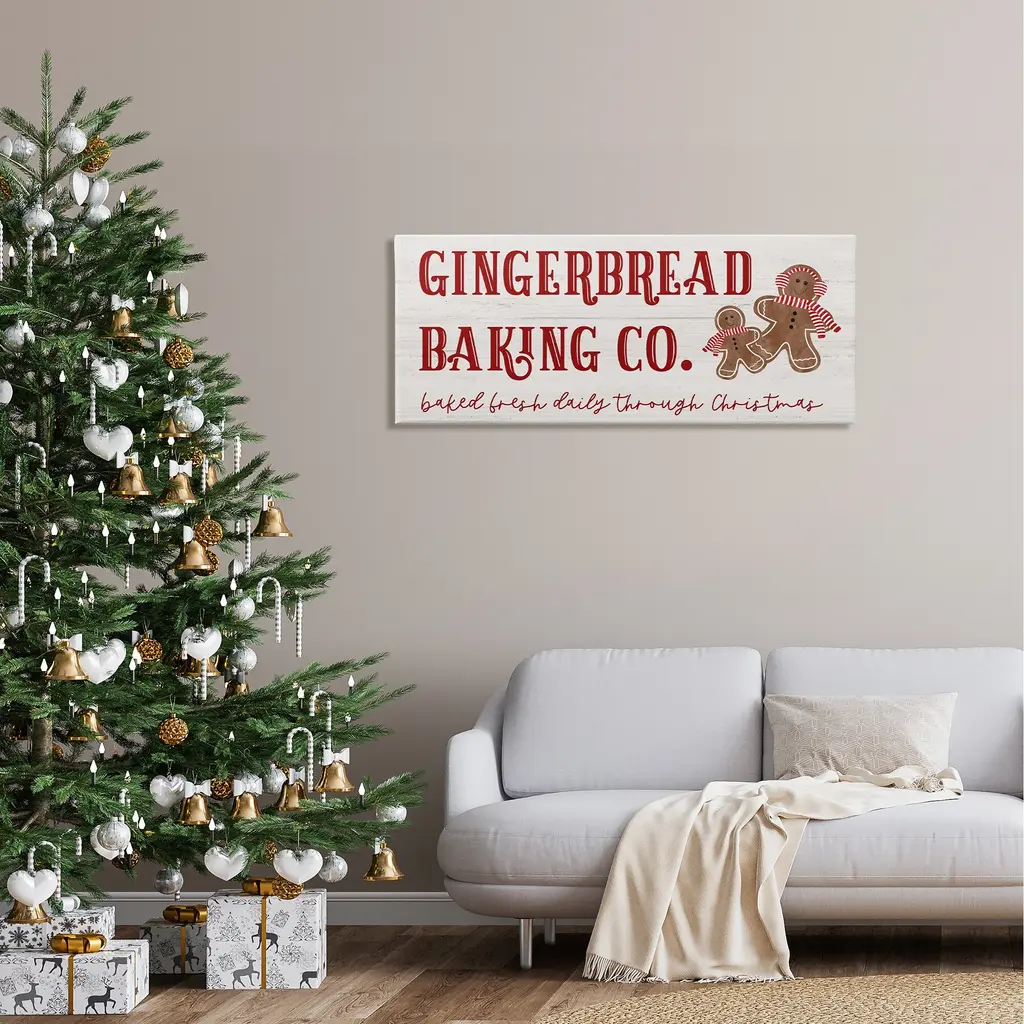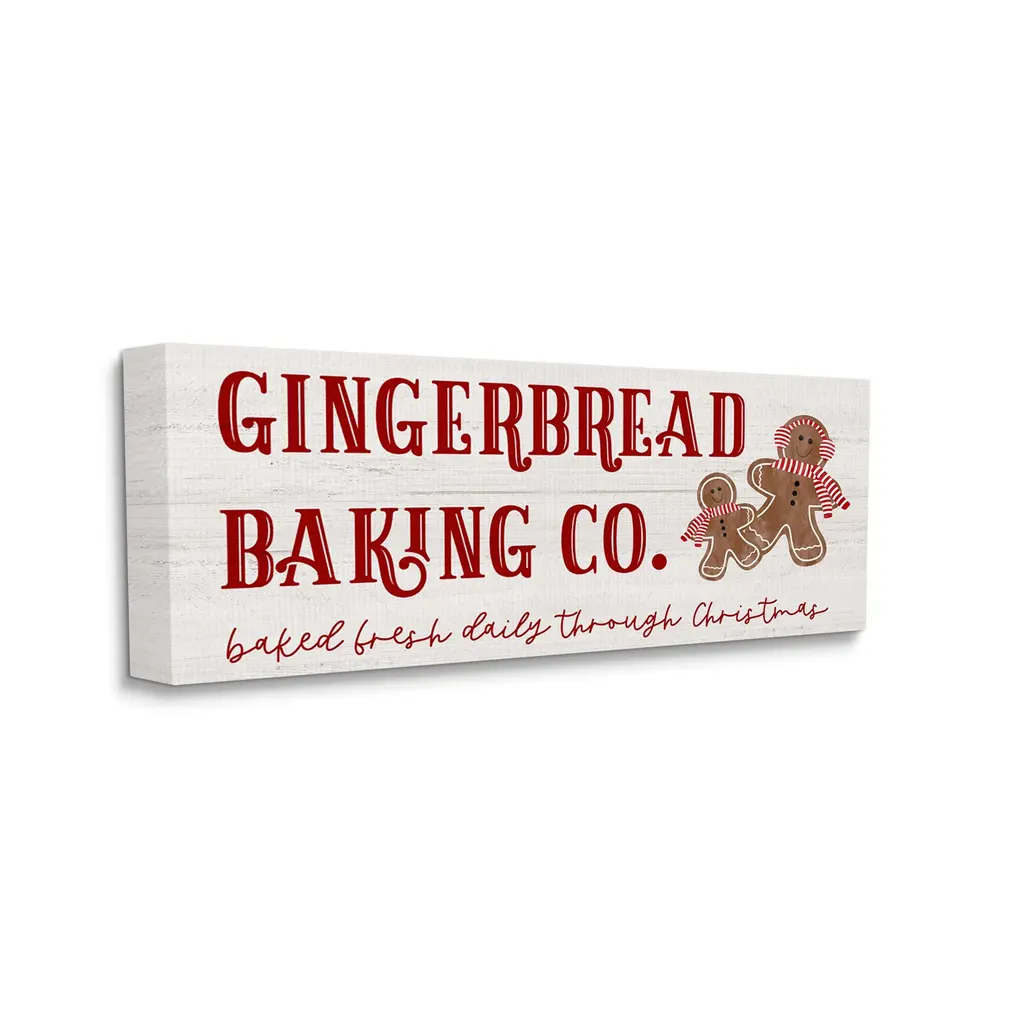 We create our stretched canvas to the highest standards. Using only the highest quality inks and canvas on Mimaki printers, we hand-cut and stretch each piece over a 1.5-inch thick wooden frame for hanging. As a result, the art comes ready to hang on the sturdy ledge with no installation required. Stupell Wall Art is made in the USA.Features: Dimensions: 24 x 1.5 x 10 InchesStretched Canvas Sizes Include Standard: 24 x 1.5 x 10 Large: 30 x 1.5 x 13 X-Large: 40 x 1.5 x 17 Oversized: 48 x 1.5 x 20Wall Art is Ready to Hang - No Installation or Hardware Needed. For Easy Set Up Lean or Layer Artwork on Shelf or Against Wall.Our stretched canvas is created with the highest standards. We use only the highest quality inks and canvas on our in house Mimaki printers, and then hand cut and stretch each piece over a 1.5 inch thick wooden frame for hanging. Made In USA.Artwork Relates To: Food, Sign, Sweets, Cookie, Gingerbread, Holiday, Gingerbread Baking Co Baked Fresh Daily Through ChristmasDesign by Natalie Carpentieri