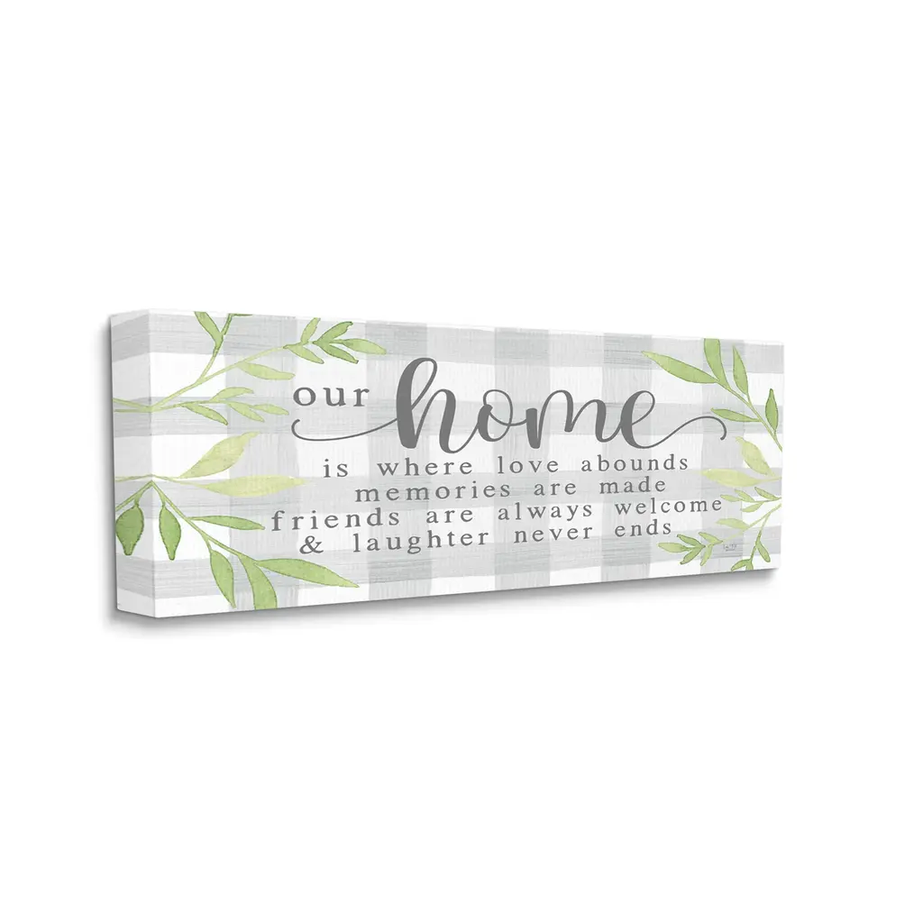 We create our stretched canvas to the highest standards. Using only the highest quality inks and canvas on Mimaki printers, we hand-cut and stretch each piece over a 1.5-inch thick wooden frame for hanging. As a result, the art comes ready to hang on the sturdy ledge with no installation required. Stupell Wall Art is made in the USA.Features: Dimensions: 24 x 1.5 x 10 InchesStretched Canvas Sizes Include Standard: 24 x 1.5 x 10 Large: 30 x 1.5 x 13 X-Large: 40 x 1.5 x 17 Oversized: 48 x 1.5 x 20Wall Art is Ready to Hang with Hardware Free Hanging. No installation required. For Easy Set Up Lean or Layer Artwork on Shelf or Against Wall.Our stretched canvas is created with the highest standards. We use only the highest quality inks and canvas on our in house Mimaki printers, and then hand cut and stretch each piece over a 1.5 inch thick wooden frame for hanging. Made In USA.Artwork Relates To: Herbs, Plant, Pattern, Leaf, Tartan, Gingham, Our Home is Where Love Abounds, Memories are Made, Friends are Always Welcome, & Laughter Never EndsDesign by Lux + Me Designs