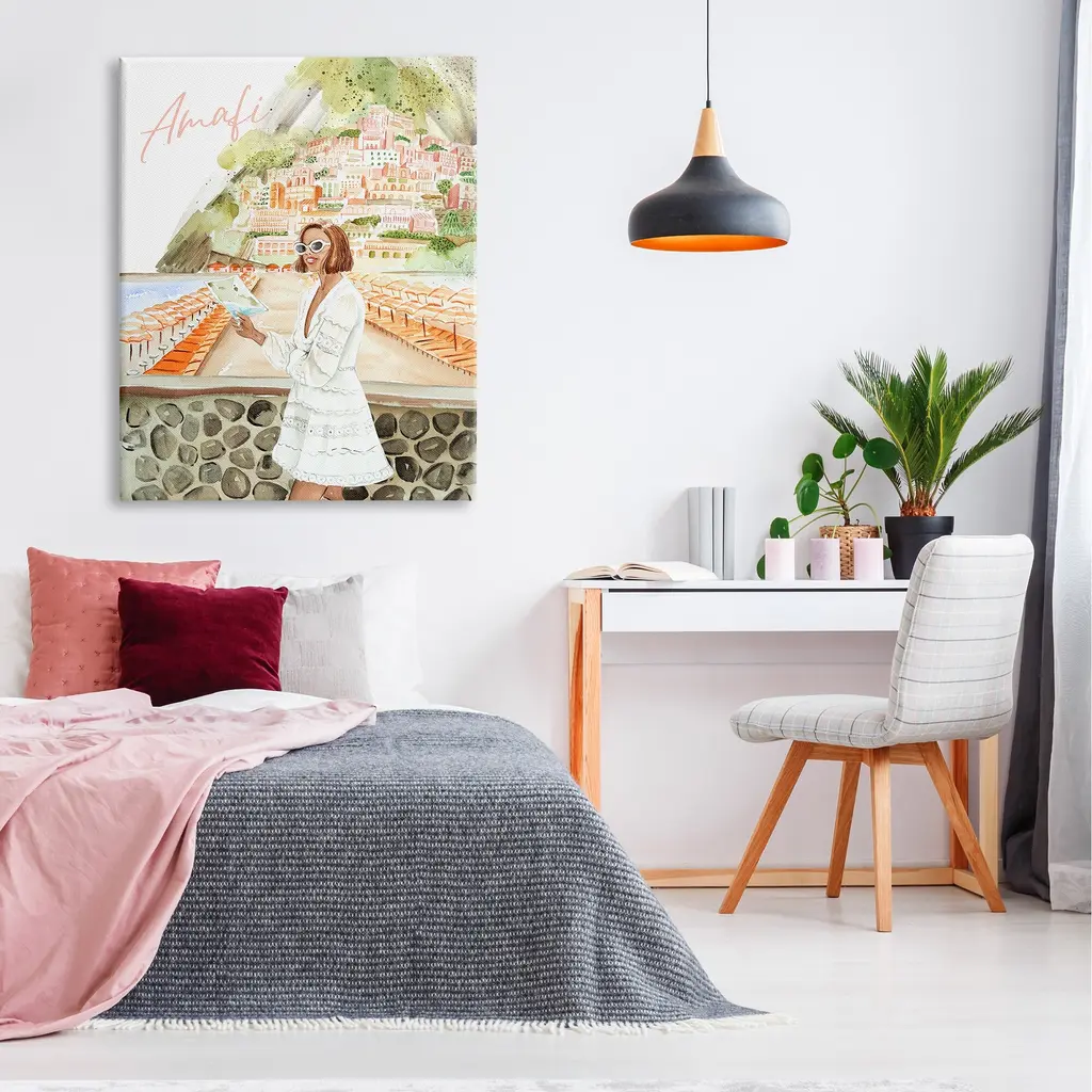 We create our stretched canvas to the highest standards. Using only the highest quality inks and canvas on Mimaki printers, we hand-cut and stretch each piece over a 1.5-inch thick wooden frame for hanging. As a result, the art comes ready to hang on the sturdy ledge with no installation required. Stupell Wall Art is made in the USA.Features: Dimensions: 16 x 1.5 x 20 InchesStretched Canvas Sizes Include Standard: 16 x 1.5 x 20 Large: 20 x 1.5 x 30 X-Large: 30 x 1.5 x 40 Oversized: 36 x 1.5 x 48Wall Art is Ready to Hang with Hardware Free Hanging. No installation required. For Easy Set Up Lean or Layer Artwork on Shelf or Against Wall.Our stretched canvas is created with the highest standards. We use only the highest quality inks and canvas on our in house Mimaki printers, and then hand cut and stretch each piece over a 1.5 inch thick wooden frame for hanging. Made In USA.Artwork Relates To: Female, Person, Woman, Painting, City, Ocean, Town, Amalfi Design by Enya Todd