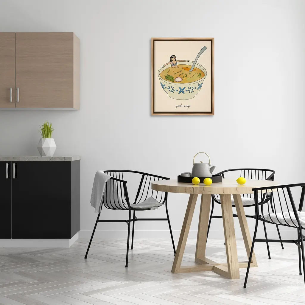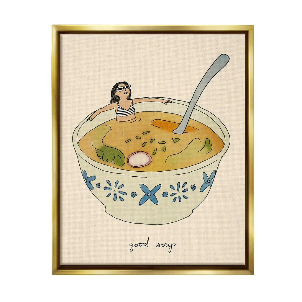 Elevate your home or office to the next level with Stupell Framed Floating Canvas Wall Art. Our premium hand-stretched canvas is mounted securely into a sturdy lightweight frame. The museum-style gap between the wrapped canvas and the box frame gives the illusion of floating artwork. Stupell Wall Art is made in the USA.Features: Dimensions: 17 x 1.7 x 21 Frame, 16 x 1.5 x 20 Canvas ArtFloating Frame Canvas Products are available in sizes 17"x21" and 25"x31". All Floating Frame Canvas Products have a 1.7" Depth.Wall Art is Ready to Hang with Hardware Free Hanging. No Installation required. For Easy Set Up Lean or Layer Artwork on Shelf or Against Wall. Artwork is Permently Fixed into the Frame.Our elevated 1.7" Thick Floating Frame is the perfect complement to our canvas style Wall Art. We use only the highest quality inks in house with industry leading printing solutions. Canvas is hand stretched over a durable wood foundation and then mounted securly into a Modern Box Frame. Made in the USA.Artwork Relates To: Food, Meal, Bowl, Cutlery, Spoon, Soup, Kitchen, Person, Woman, Swimsuit, Good SoupDesign by Victoria Barnes