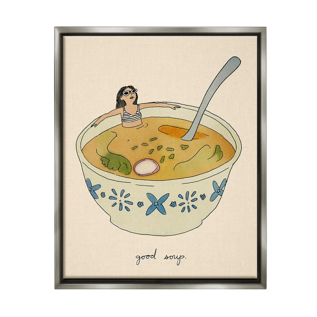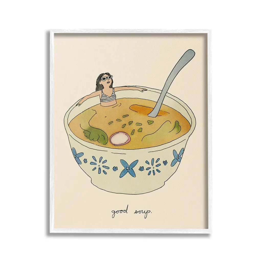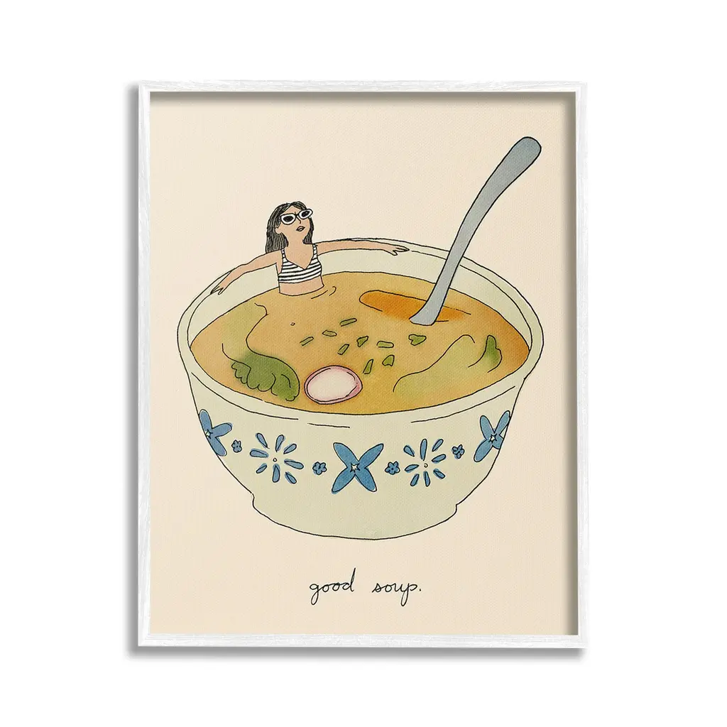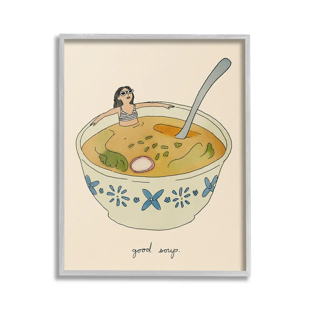 Add dimension to any room with our textured Framed Giclee Artwork. Our framed artwork is securely mounted into a 1.5-inch thick wood grain frame and ready to hang. Frames are available in three alluring styles: black, gray farmhouse and white. In addition, you should check out our oversized options if you want a statement piece. Stupell Wall Art is made in the USA.Features: Dimensions: 11 x 1.5 x 14 FramedFramed Giclee Products are available in the sizes 11"x14", 16"x20" or 24"x30". All Framed Giclee Products have a 1.5" Depth. Wall Art is Ready to Hang with Hardware Free Hanging. No installation required. For Easy Set Up Lean or Layer Artwork on Shelf or Against Wall.Our giclée prints are carefully mounted on a durable MDF backing, and then perfectly finished in a 1.5 inch thick woodgrain frame. Mounted frame colors include black, gray farmhouse and white. Made In USA.Artwork Relates To: Food, Meal, Bowl, Cutlery, Spoon, Soup, Kitchen, Person, Woman, Swimsuit, Good SoupDesign by Victoria Barnes