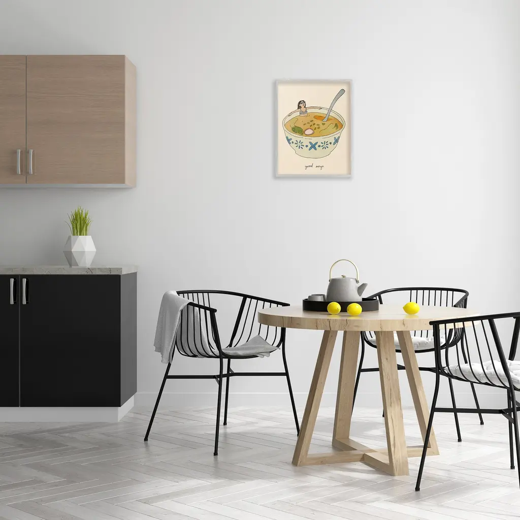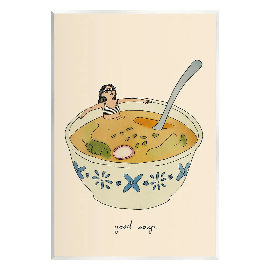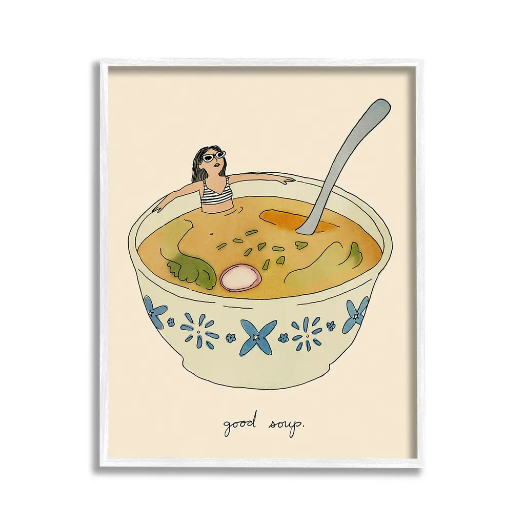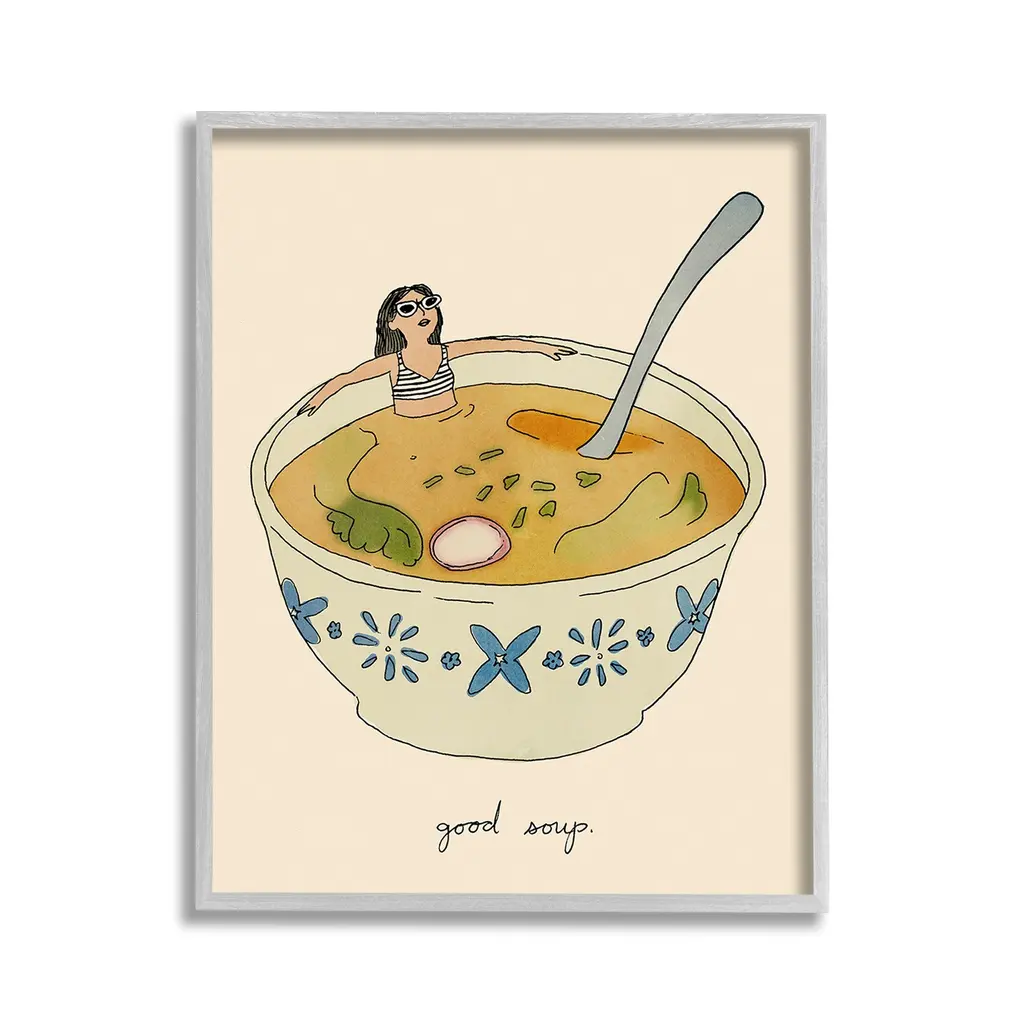 Add dimension to any room with our textured Framed Giclee Artwork. Our framed artwork is securely mounted into a 1.5-inch thick wood grain frame and ready to hang. Frames are available in three alluring styles: black, gray farmhouse and white. In addition, you should check out our oversized options if you want a statement piece. Stupell Wall Art is made in the USA.Features: Dimensions: 11 x 1.5 x 14 FramedFramed Giclee Products are available in the sizes 11"x14", 16"x20" or 24"x30". All Framed Giclee Products have a 1.5" Depth. Wall Art is Ready to Hang with Hardware Free Hanging. No installation required. For Easy Set Up Lean or Layer Artwork on Shelf or Against Wall.Our giclée prints are carefully mounted on a durable MDF backing, and then perfectly finished in a 1.5 inch thick woodgrain frame. Mounted frame colors include black, gray farmhouse and white. Made In USA.Artwork Relates To: Food, Meal, Bowl, Cutlery, Spoon, Soup, Kitchen, Person, Woman, Swimsuit, Good SoupDesign by Victoria Barnes