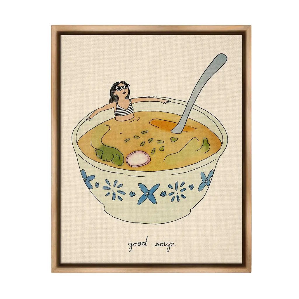 Add dimension to any room with our textured Framed Giclee Artwork. Our framed artwork is securely mounted into a 1.5-inch thick wood grain frame and ready to hang. Frames are available in three alluring styles: black, gray farmhouse and white. In addition, you should check out our oversized options if you want a statement piece. Stupell Wall Art is made in the USA.Features: Dimensions: 11 x 1.5 x 14 FramedFramed Giclee Products are available in the sizes 11"x14", 16"x20" or 24"x30". All Framed Giclee Products have a 1.5" Depth. Wall Art is Ready to Hang with Hardware Free Hanging. No installation required. For Easy Set Up Lean or Layer Artwork on Shelf or Against Wall.Our giclée prints are carefully mounted on a durable MDF backing, and then perfectly finished in a 1.5 inch thick woodgrain frame. Mounted frame colors include black, gray farmhouse and white. Made In USA.Artwork Relates To: Food, Meal, Bowl, Cutlery, Spoon, Soup, Kitchen, Person, Woman, Swimsuit, Good SoupDesign by Victoria Barnes