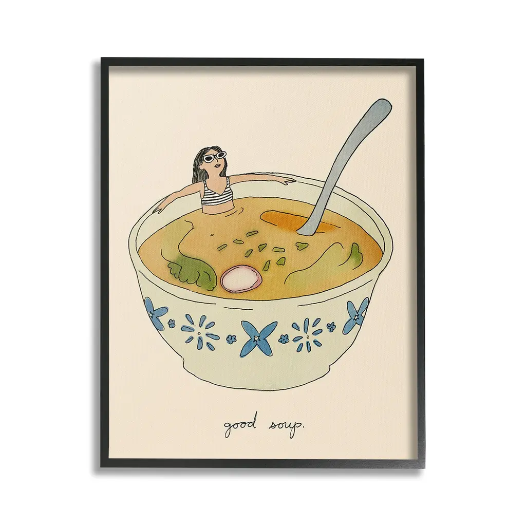 Our wall plaques start as high-quality lithograph prints mounted on durable 0.5-inch thick MDF wood. Each piece is hand finished and comes with a fresh layer of white foil on the sides to give it a crisp, clean look. Plaques arrive ready to hang without installation and come with removable plastic corners to keep them from damage in transit. Stupell Wall Art is made in the USA.Features: Dimensions: 10 x 0.5 x 15 InchesWall Plaque Product Sizes Include 10"x15" and 13"x19". All wall plaque products have a 0.5" Depth. Wall Art is Ready to Hang with Hardware Free Hanging. No installation required. For Easy Set Up Lean or Layer Artwork on Shelf or Against Wall.All of our wall plaques start off as high quality lithograph prints that are then mounted on durable 0.5 inch thick MDF wood. Each piece is hand finished and comes with a fresh layer of foil on the sides to give it a crisp clean look. Made In USA.Artwork Relates To: Food, Meal, Bowl, Cutlery, Spoon, Soup, Kitchen, Person, Woman, Swimsuit, Good SoupDesign by Victoria Barnes