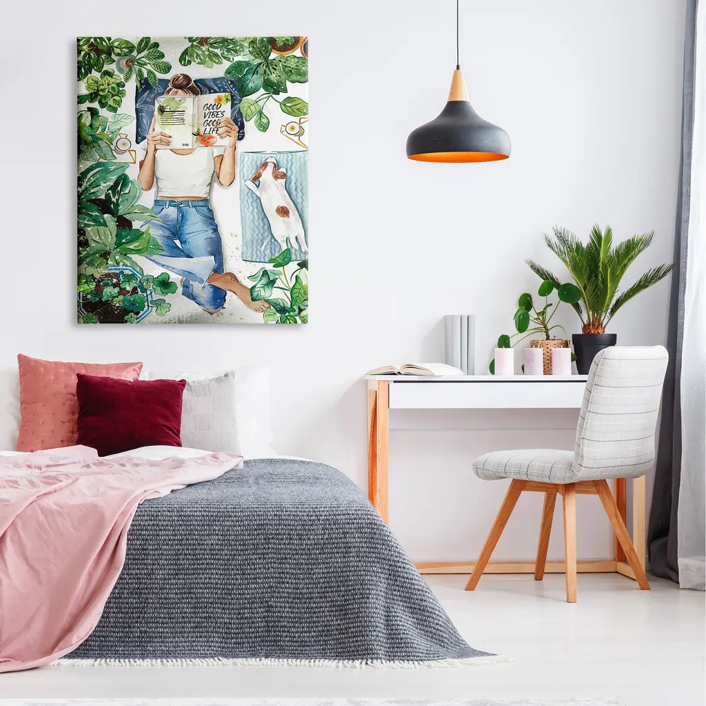We create our stretched canvas to the highest standards. Using only the highest quality inks and canvas on Mimaki printers, we hand-cut and stretch each piece over a 1.5-inch thick wooden frame for hanging. As a result, the art comes ready to hang on the sturdy ledge with no installation required. Stupell Wall Art is made in the USA.Features: Dimensions: 16 x 1.5 x 20 InchesStretched Canvas Sizes Include Standard: 16 x 1.5 x 20 Large: 20 x 1.5 x 30 X-Large: 30 x 1.5 x 40 Oversized: 36 x 1.5 x 48Wall Art is Ready to Hang with Hardware Free Hanging. No installation required. For Easy Set Up Lean or Layer Artwork on Shelf or Against Wall.Our stretched canvas is created with the highest standards. We use only the highest quality inks and canvas on our in house Mimaki printers, and then hand cut and stretch each piece over a 1.5 inch thick wooden frame for hanging. Made In USA.Artwork Relates To: Herbs, Plant, Book, Person, Jeans, Leaf, Vegetation, Dog, Spring, Summer, Reading, Botanical, RelaxingDesign by Enya Todd