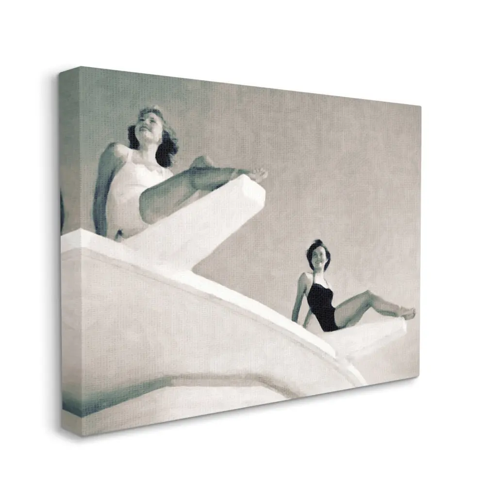 We create our stretched canvas to the highest standards. Using only the highest quality inks and canvas on Mimaki printers, we hand-cut and stretch each piece over a 1.5-inch thick wooden frame for hanging. As a result, the art comes ready to hang on the sturdy ledge with no installation required. Stupell Wall Art is made in the USA.Features: Dimensions: 20 x 1.5 x 16 InchesStretched Canvas Sizes Include Standard: 20 x 1.5 x 16 Large: 30 x 1.5 x 20 X-Large: 40 x 1.5 x 30 Oversized: 48 x 1.5 x 36Wall Art is Ready to Hang with Hardware Free Hanging. No installation required. For Easy Set Up Lean or Layer Artwork on Shelf or Against Wall.Our stretched canvas is created with the highest standards. We use only the highest quality inks and canvas on our in house Mimaki printers, and then hand cut and stretch each piece over a 1.5 inch thick wooden frame for hanging. Made In USA.Artwork Relates To: People, Girl, Female, Women, Vintage, Pool, Diving BoardDesign by Graffi*Tee Studios
