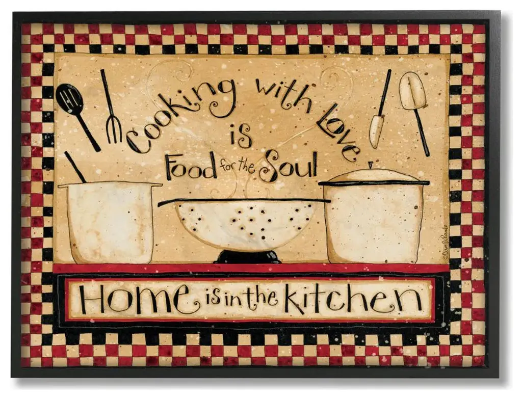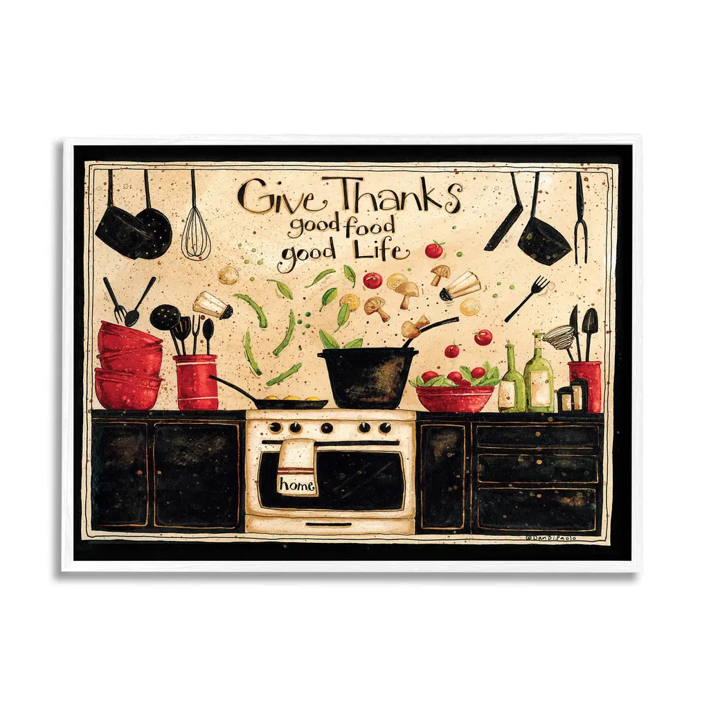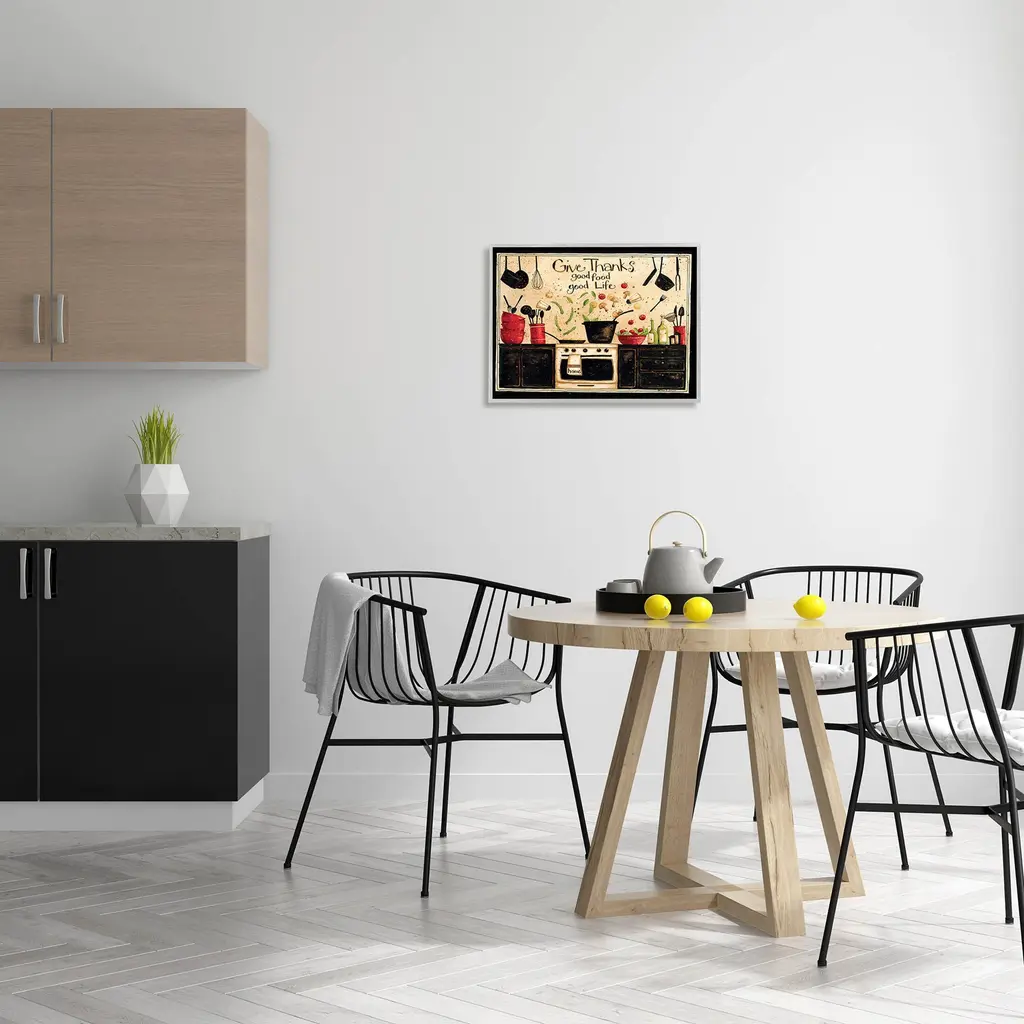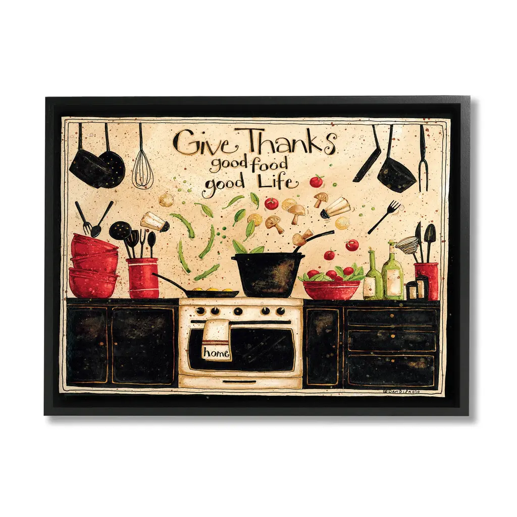 Our Framed Giclee Wall Art adds a touch of class to any space in your home or office. Frames are available in three alluring styles: black, gray farmhouse and white. Our textured artwork will add more depth and dimension to any space. Each piece is mounted with a 1.5 inch thick wood grain frame that is ready to hang! Looking for a statement piece? We have oversized artwork available.Features: Dimensions: 14 x 1.5 x 11 FramedFramed Giclee Sizes Include Standard: 14 x 1.5 x 11 Large: 20 x 1.5 x 16 Oversized: 30 x 1.5 x 24Wall Art is Ready to Hang - No Installation or Hardware Needed. For Easy Set Up Lean or Layer Artwork on Shelf or Against Wall.Our giclée prints are carefully mounted on a durable MDF backing, and then perfectly finished in a 1.5 inch thick woodgrain frame. Mounted frame colors include black, gray farmhouse and white. Made In USA.Artwork Relates To: Cutlery, Spoon, People, Produce, Food, Meal, Kitchen, Dinner, Dining, Chef, Vintage, Checkered, PatternDesign by Dan DiPaoloFirst perfectly in any Kitchen, Dining Room, Bar or Pantry.Text Includes: Give Thanks. Good Food. Good Life