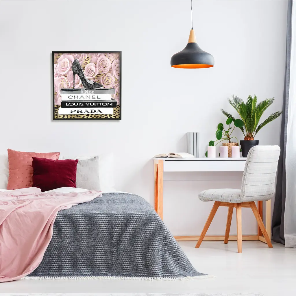 Stupell Glam High Heel Shoe Fashion Book Stack Cheetah Framed Wall Art - Black - 24 X 24 - Black