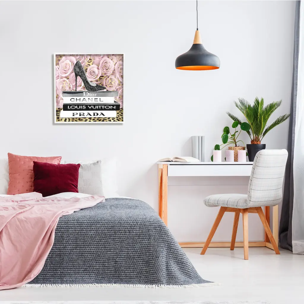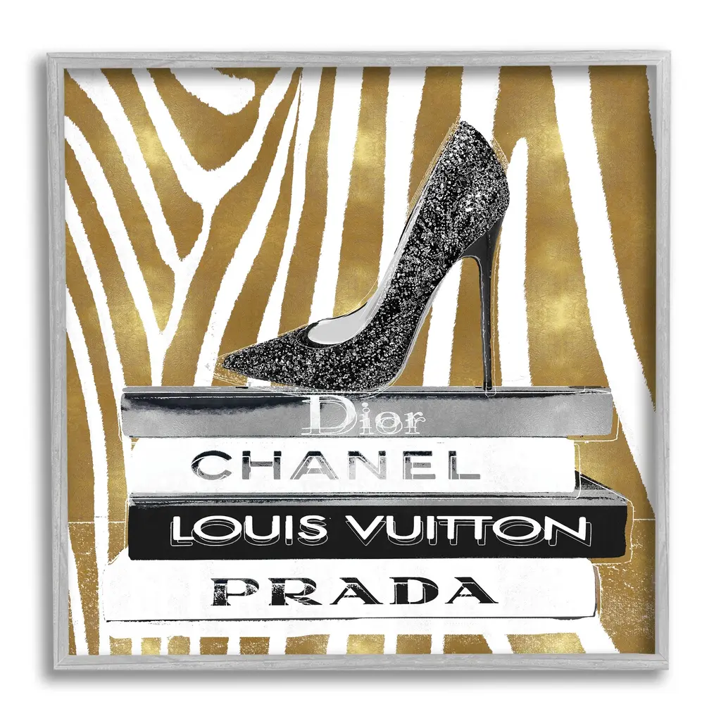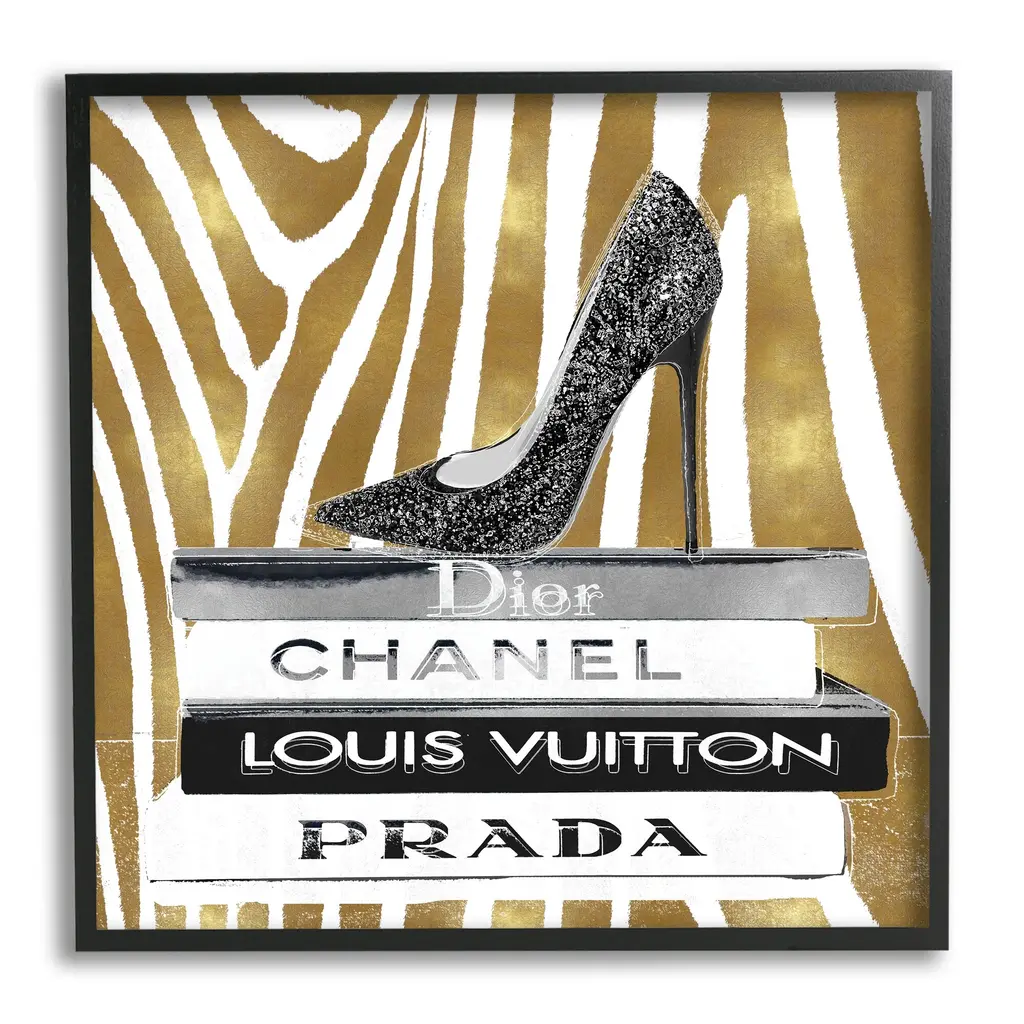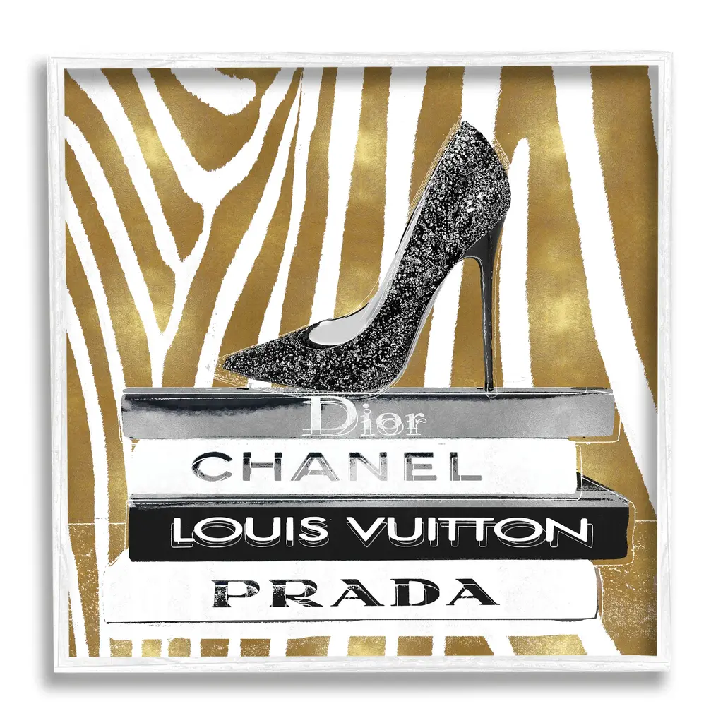 Stupell Glam High Heel Shoe Fashion Book Stack Cheetah Framed Wall Art - Black - 24 X 24 - White