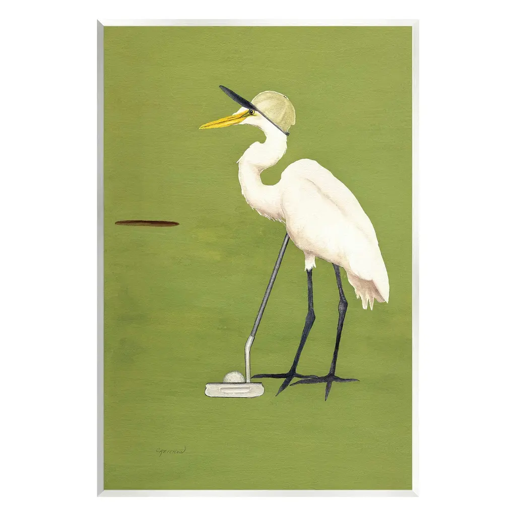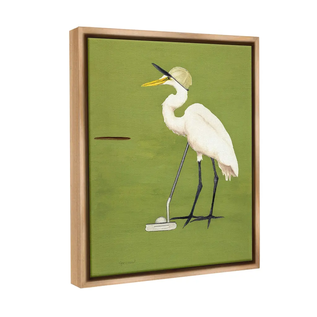 Elevate your home or office to the next level with Stupell Framed Floating Canvas Wall Art. Our premium hand-stretched canvas is mounted securely into a sturdy lightweight frame. The museum-style gap between the wrapped canvas and the box frame gives the illusion of floating artwork. Stupell Wall Art is made in the USA.Features: Dimensions: 17 x 1.7 x 21 Frame, 16 x 1.5 x 20 Canvas ArtFloating Frame Canvas Products are available in sizes 17"x21" and 25"x31". All Floating Frame Canvas Products have a 1.7" Depth.Wall Art is Ready to Hang with Hardware Free Hanging. No Installation required. For Easy Set Up Lean or Layer Artwork on Shelf or Against Wall. Artwork is Permently Fixed into the Frame.Our elevated 1.7" Thick Floating Frame is the perfect complement to our canvas style Wall Art. We use only the highest quality inks in house with industry leading printing solutions. Canvas is hand stretched over a durable wood foundation and then mounted securly into a Modern Box Frame. Made in the USA.Artwork Relates To: Animal, Bird, Waterfowl, Egret, Heron, Golf, Golfing, Sport, Golf Course, Golf ClubDesign by Christine Reichow
