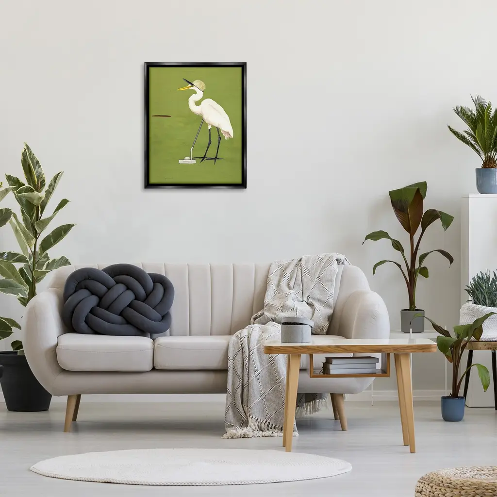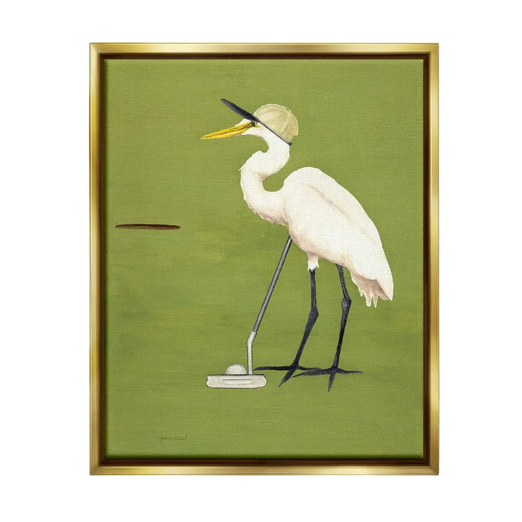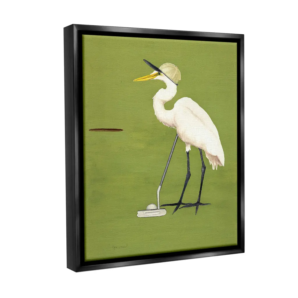 Elevate your home or office to the next level with Stupell Framed Floating Canvas Wall Art. Our premium hand-stretched canvas is mounted securely into a sturdy lightweight frame. The museum-style gap between the wrapped canvas and the box frame gives the illusion of floating artwork. Stupell Wall Art is made in the USA.Features: Dimensions: 17 x 1.7 x 21 Frame, 16 x 1.5 x 20 Canvas ArtFloating Frame Canvas Products are available in sizes 17"x21" and 25"x31". All Floating Frame Canvas Products have a 1.7" Depth.Wall Art is Ready to Hang with Hardware Free Hanging. No Installation required. For Easy Set Up Lean or Layer Artwork on Shelf or Against Wall. Artwork is Permently Fixed into the Frame.Our elevated 1.7" Thick Floating Frame is the perfect complement to our canvas style Wall Art. We use only the highest quality inks in house with industry leading printing solutions. Canvas is hand stretched over a durable wood foundation and then mounted securly into a Modern Box Frame. Made in the USA.Artwork Relates To: Animal, Bird, Waterfowl, Egret, Heron, Golf, Golfing, Sport, Golf Course, Golf ClubDesign by Christine Reichow