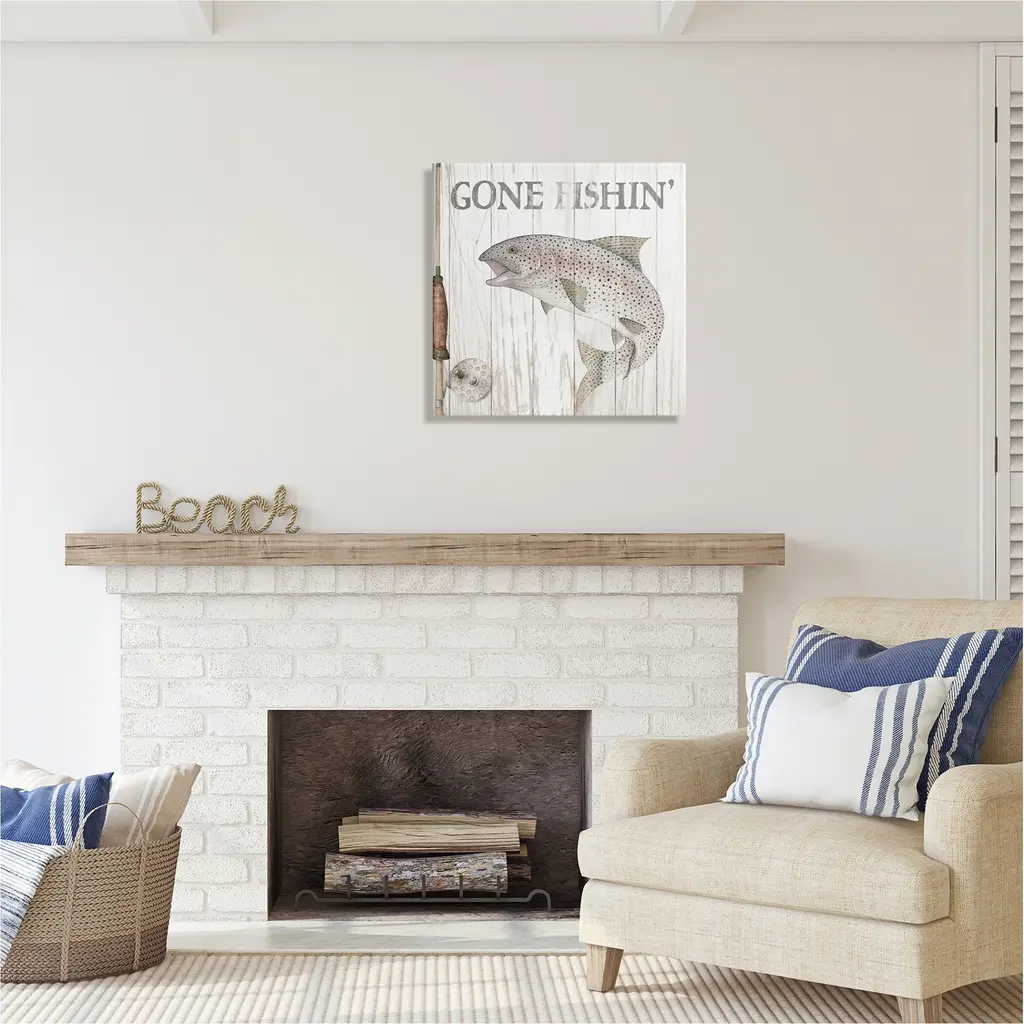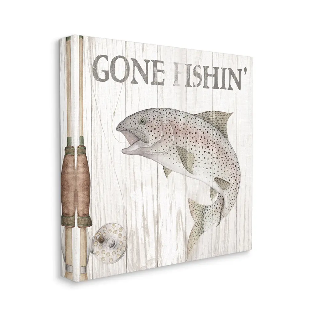 We create our stretched canvas to the highest standards. Using only the highest quality inks and canvas on Mimaki printers, we hand-cut and stretch each piece over a 1.5-inch thick wooden frame for hanging. As a result, the art comes ready to hang on the sturdy ledge with no installation required. Stupell Wall Art is made in the USA.Features: Dimensions: 17 x 1.5 x 17 InchesStretched Canvas Sizes Include Standard: 17 x 1.5 x 17 Large: 24 x 1.5 x 24 X-Large: 30 x 1.5 x 30 Oversized: 36 x 1.5 x 36Wall Art is Ready to Hang with Hardware Free Hanging. No installation required. For Easy Set Up Lean or Layer Artwork on Shelf or Against Wall.Our stretched canvas is created with the highest standards. We use only the highest quality inks and canvas on our in house Mimaki printers, and then hand cut and stretch each piece over a 1.5 inch thick wooden frame for hanging. Made In USA.Artwork Relates To: Animal, Fish, Sea Life, Trout, Sign, Fishing, Gone Fishin'Design by Wild Apple Portfolio