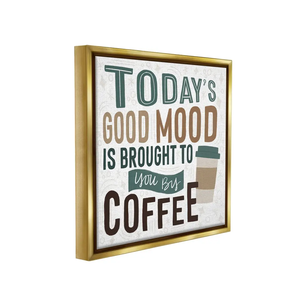 Elevate your home or office to the next level with Stupell Framed Floating Canvas Wall Art. Our premium hand-stretched canvas is mounted securely into a sturdy lightweight frame. The museum-style gap between the wrapped canvas and the box frame gives the illusion of floating artwork. Stupell Wall Art is made in the USA.Features: Dimensions: 18 x 1.7 x 18 Frame, 17 x 1.5 x 17 Canvas ArtFloating Frame Canvas Products are available in sizes 18"x18" and 25"x25". All Floating Frame Canvas Products have a 1.7" Depth.Wall Art is Ready to Hang with Hardware Free Hanging. No Installation required. For Easy Set Up Lean or Layer Artwork on Shelf or Against Wall. Artwork is Permently Fixed into the Frame.Our elevated 1.7" Thick Floating Frame is the perfect complement to our canvas style Wall Art. We use only the highest quality inks in house with industry leading printing solutions. Canvas is hand stretched over a durable wood foundation and then mounted securly into a Modern Box Frame. Made in the USA.Artwork Relates To: Beverage, Coffee, Coffee Cup, Pattern, Humor, Funny, Sassy, Today's Good Mood is Brought to You By CoffeeDesign by Lady Louise Designs