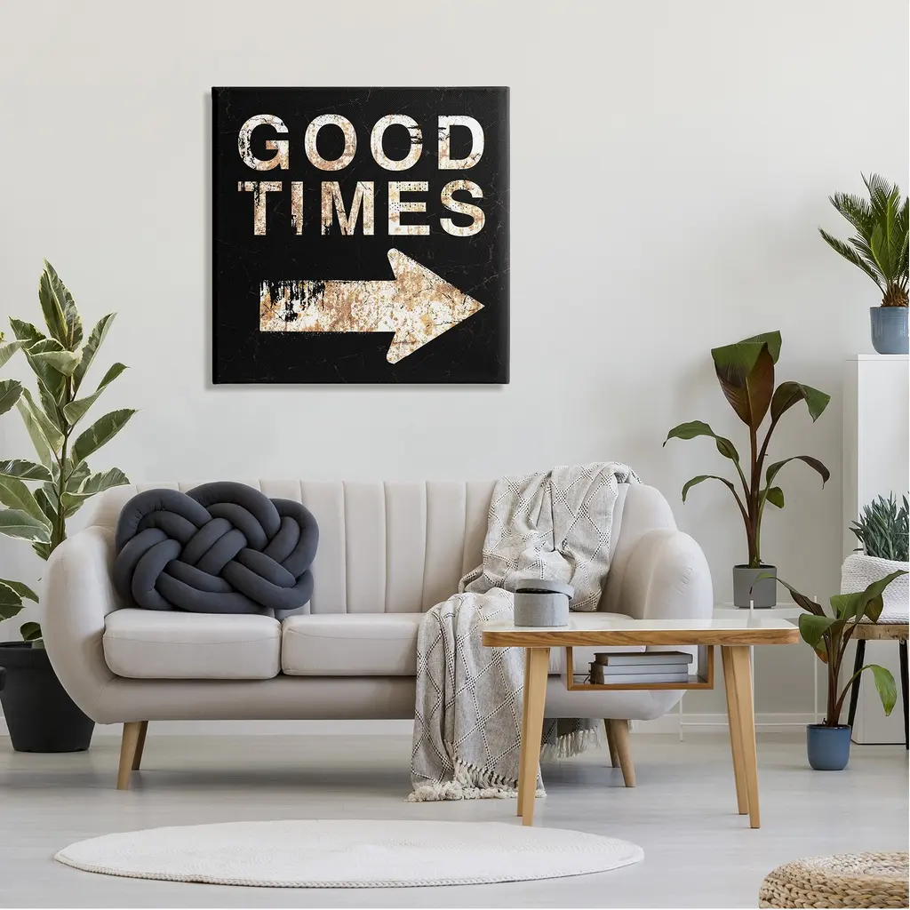 We create our stretched canvas to the highest standards. Using only the highest quality inks and canvas on Mimaki printers, we hand-cut and stretch each piece over a 1.5-inch thick wooden frame for hanging. As a result, the art comes ready to hang on the sturdy ledge with no installation required. Stupell Wall Art is made in the USA.Features: Dimensions: 17 x 1.5 x 17 InchesStretched Canvas Sizes Include Standard: 17 x 1.5 x 17 Large: 24 x 1.5 x 24 X-Large: 30 x 1.5 x 30 Oversized: 36 x 1.5 x 36Wall Art is Ready to Hang with Hardware Free Hanging. No installation required. For Easy Set Up Lean or Layer Artwork on Shelf or Against Wall.Our stretched canvas is created with the highest standards. We use only the highest quality inks and canvas on our in house Mimaki printers, and then hand cut and stretch each piece over a 1.5 inch thick wooden frame for hanging. Made In USA.Artwork Relates To: Phrase, Good Times, Rustic, ArrowDesign by Peter Horjus