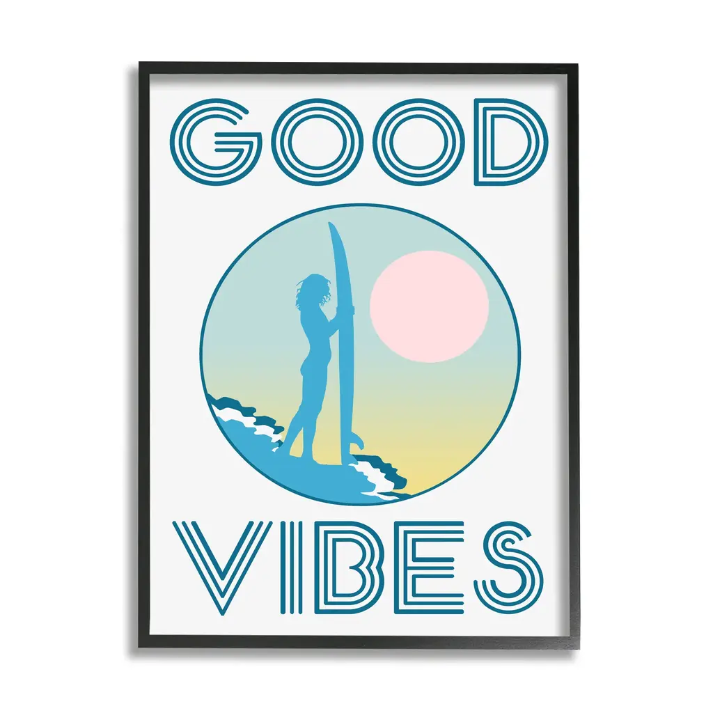Stupell Good Vibes Text Blue Surfer Chick Sunset Framed Wall Art - 11 X 14 - Black