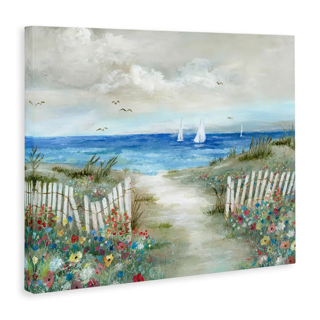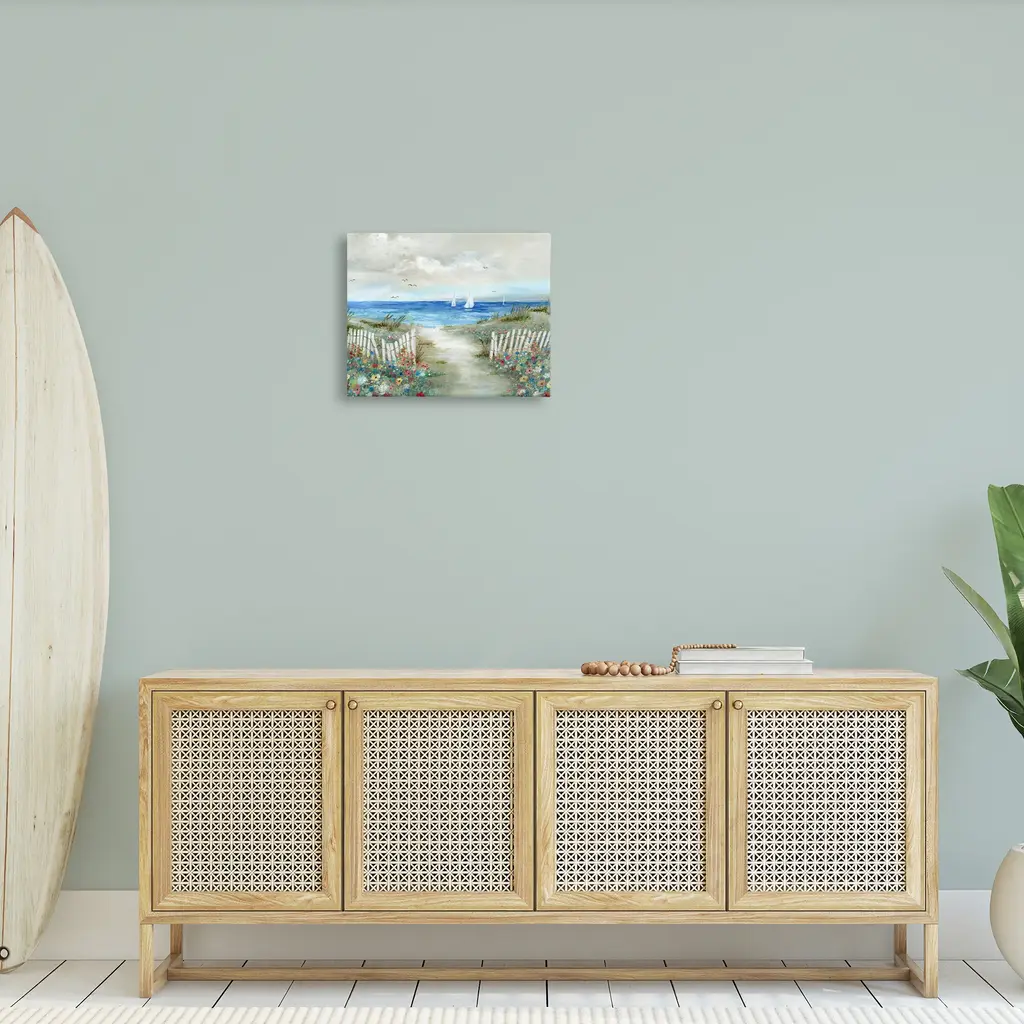 Stupell Gorgeous Beach Scene Poppies Blooming White Fence Ocean Canvas Wall Art - 16 X 20