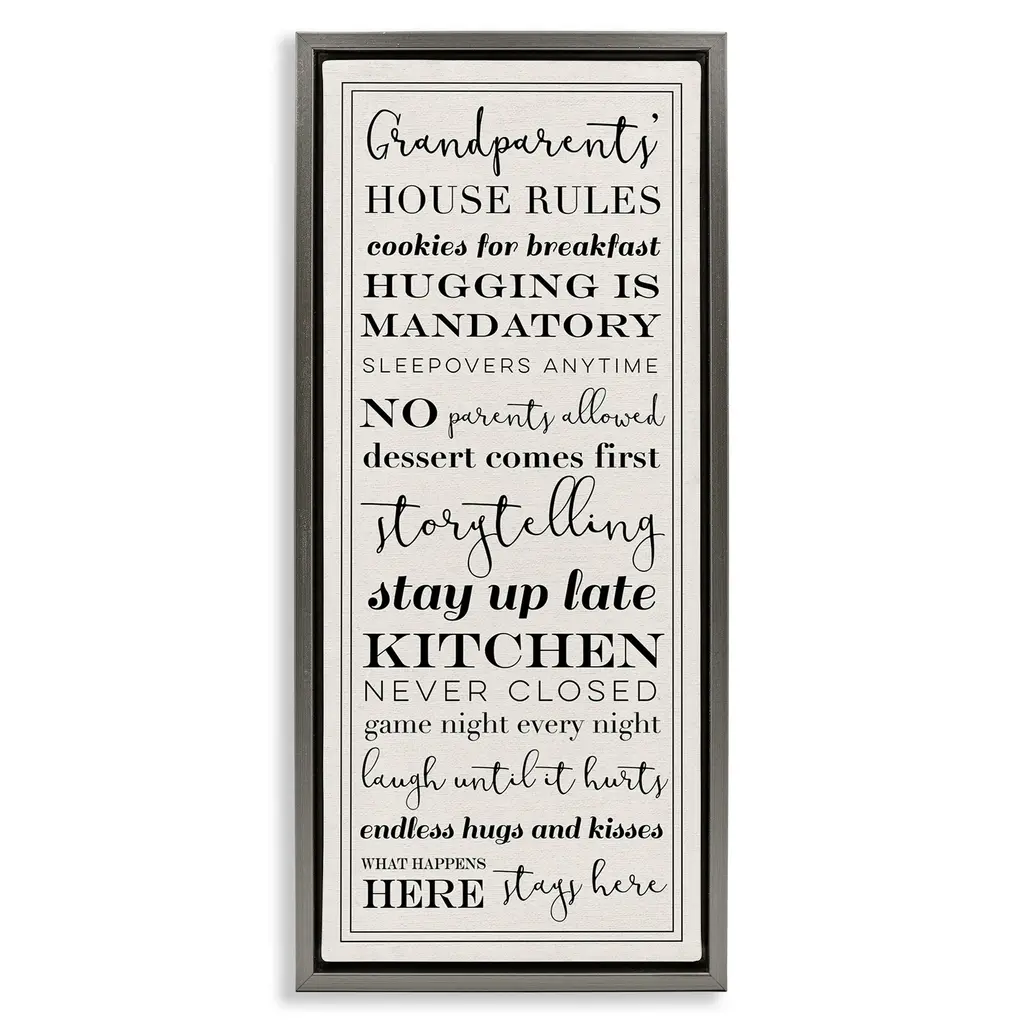Elevate your home or office to the next level with Stupell Framed Floating Canvas Wall Art. Our premium hand-stretched canvas is mounted securely into a sturdy lightweight frame. The museum-style gap between the wrapped canvas and the box frame gives the illusion of floating artwork. Stupell Wall Art is made in the USA.Features: Dimensions: 11 x 1.7 x 25 Frame, 10 x 1.5 x 24 Canvas ArtFloating Frame Canvas Products are available in sizes 11"x25" and 14"x31". All Floating Frame Canvas Products have a 1.7" Depth.Wall Art is Ready to Hang with Hardware Free Hanging. No Installation required. For Easy Set Up Lean or Layer Artwork on Shelf or Against Wall. Artwork is Permently Fixed into the Frame.Our elevated 1.7" Thick Floating Frame is the perfect complement to our canvas style Wall Art. We use only the highest quality inks in house with industry leading printing solutions. Canvas is hand stretched over a durable wood foundation and then mounted securly into a Modern Box Frame. Made in the USA.Artwork Relates To: Phrase, Family, Inspirational, GrandparentsDesign by Daphne Polselli