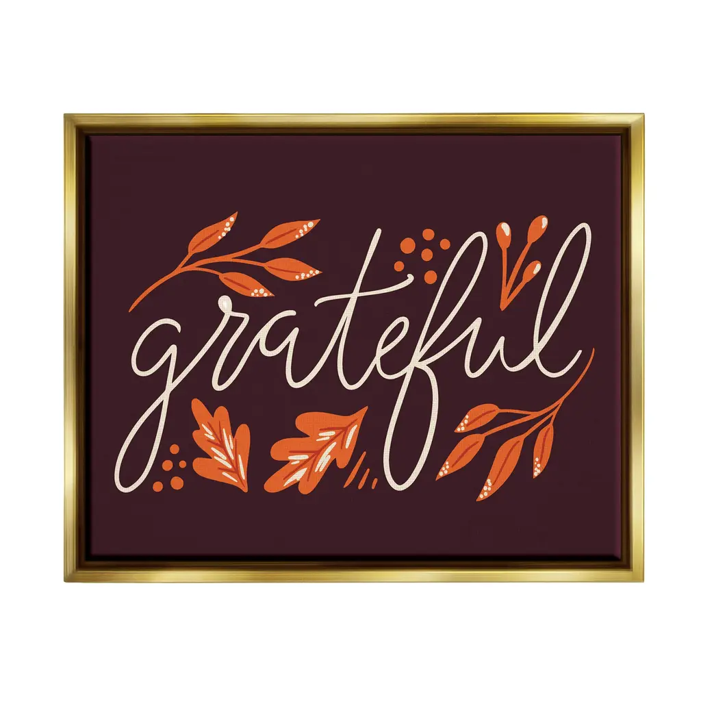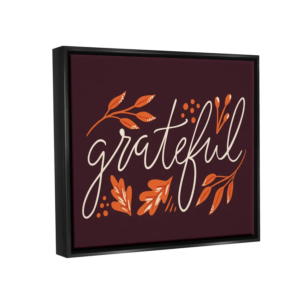 Elevate your home or office to the next level with Stupell Framed Floating Canvas Wall Art. Our premium hand stretched canvas is mounted securly into a sturdy lightweight frame. The museum style gap between wrapped canvas and box frame gives the illusion of floating artwork. Features: Dimensions: 21 x 1.7 x 17 Frame, 20 x 1.5 x 16 Canvas ArtFloating Frame Sizes Include Standard: 21 x 1.7 x 17 Oversized: 31 x 1.7 x 25Wall Art is Ready to Hang - No Installation or Hardware Needed. For Easy Set Up Lean or Layer Artwork on Shelf or Against Wall.Our elevated 1.7" Thick Floating Frame is the perfect complement to our canvas style Wall Art. We use only the highest quality inks in house with industry leading printing solutions. Canvas is hand stretched over a durable wood foundation and then mounted securly into a Modern Box Frame. Made in the USA.Artwork Relates To: Leaf, Botanical, Fall, AutumnDesign by Louise Allen DesignsLiving Room, Den, Hallway, Office, Entryway, Study, Dining Room or Bed Room.Text Includes: Grateful