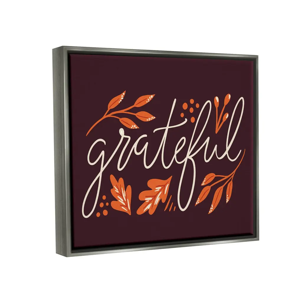 Elevate your home or office to the next level with Stupell Framed Floating Canvas Wall Art. Our premium hand stretched canvas is mounted securly into a sturdy lightweight frame. The museum style gap between wrapped canvas and box frame gives the illusion of floating artwork. Features: Dimensions: 21 x 1.7 x 17 Frame, 20 x 1.5 x 16 Canvas ArtFloating Frame Sizes Include Standard: 21 x 1.7 x 17 Oversized: 31 x 1.7 x 25Wall Art is Ready to Hang - No Installation or Hardware Needed. For Easy Set Up Lean or Layer Artwork on Shelf or Against Wall.Our elevated 1.7" Thick Floating Frame is the perfect complement to our canvas style Wall Art. We use only the highest quality inks in house with industry leading printing solutions. Canvas is hand stretched over a durable wood foundation and then mounted securly into a Modern Box Frame. Made in the USA.Artwork Relates To: Leaf, Botanical, Fall, AutumnDesign by Louise Allen DesignsLiving Room, Den, Hallway, Office, Entryway, Study, Dining Room or Bed Room.Text Includes: Grateful