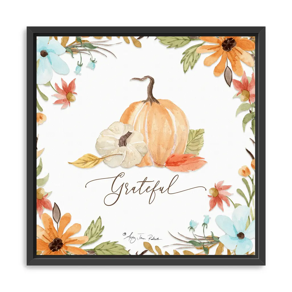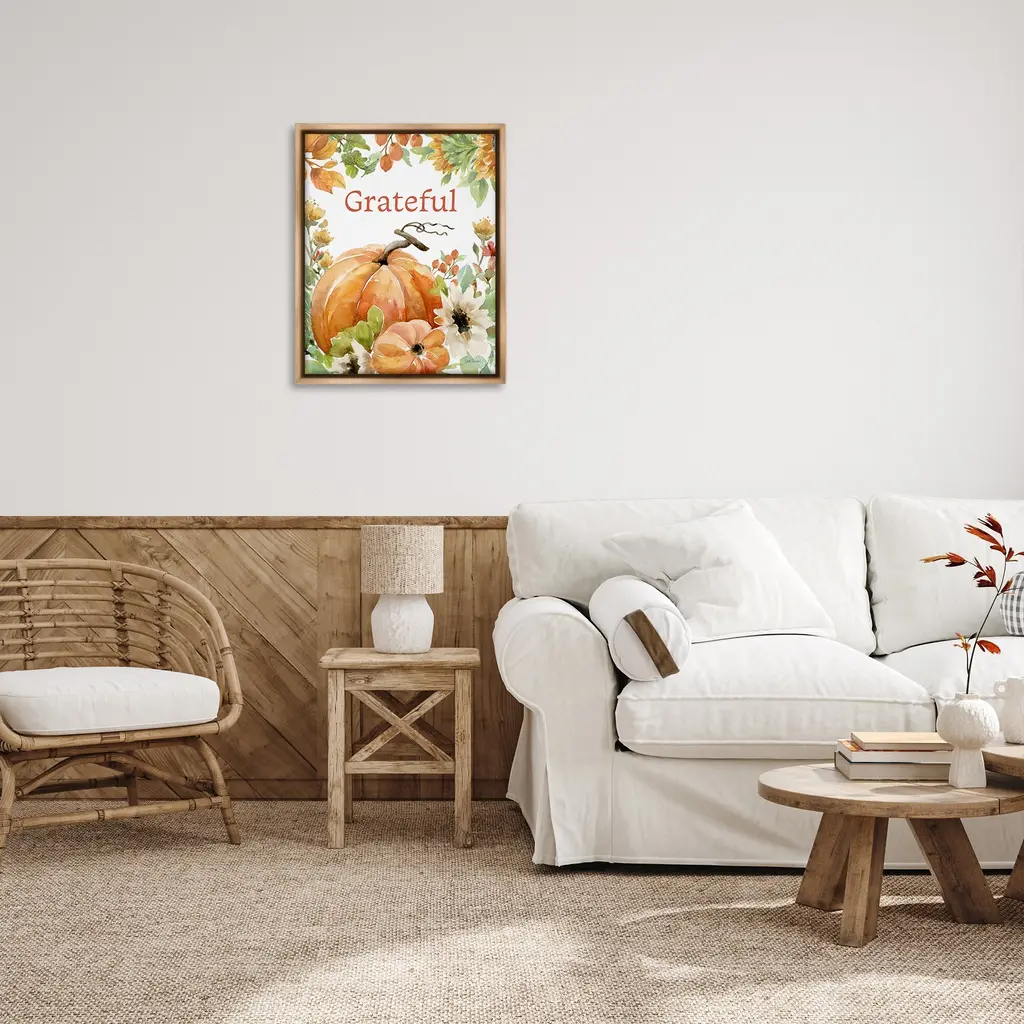 Elevate your home or office to the next level with Stupell Framed Floating Canvas Wall Art. Our premium hand-stretched canvas is mounted securely into a sturdy lightweight frame. The museum-style gap between the wrapped canvas and the box frame gives the illusion of floating artwork. Stupell Wall Art is made in the USA.Features: Dimensions: 17 x 1.7 x 21 Frame, 16 x 1.5 x 20 Canvas ArtFloating Frame Canvas Products are available in sizes 17"x21" and 25"x31". All Floating Frame Canvas Products have a 1.7" Depth.Wall Art is Ready to Hang with Hardware Free Hanging. No Installation required. For Easy Set Up Lean or Layer Artwork on Shelf or Against Wall. Artwork is Permently Fixed into the Frame.Our elevated 1.7" Thick Floating Frame is the perfect complement to our canvas style Wall Art. We use only the highest quality inks in house with industry leading printing solutions. Canvas is hand stretched over a durable wood foundation and then mounted securly into a Modern Box Frame. Made in the USA.Artwork Relates To: Plant, Produce, Pumpkin, Vegetable, Gourd, Countryside, Farm, Harvest, Nature, Fall, Autumn, Flower, Sunflower, GratefulDesign by Leslie Trimbach