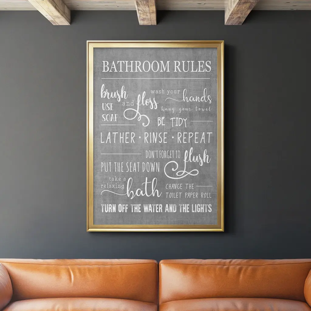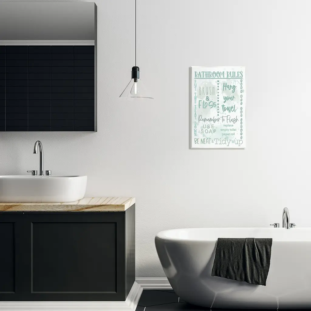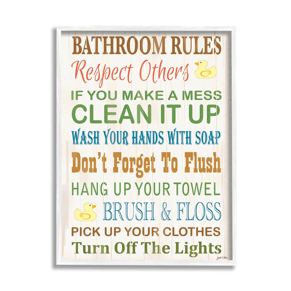 Our wall plaques start as high-quality lithograph prints mounted on durable 0.5-inch thick MDF wood. Each piece is hand finished and comes with a fresh layer of white foil on the sides to give it a crisp, clean look. Plaques arrive ready to hang without installation and come with removable plastic corners to keep them from damage in transit. Wall Art is made in the USA.Features: Dimensions: 10 x 0.5 x 15 InchesWall Plaque Sizes Include Standard: 10 x 0.5 x 15 Oversized: 13 x 0.5 x 19Wall Art is Ready to Hang with Hardware Free Hanging. No installation required. For Easy Set Up Lean or Layer Artwork on Shelf or Against Wall.All of our wall plaques start off as high quality lithograph prints that are then mounted on durable 0.5 inch thick MDF wood. Each piece is hand finished and comes with a fresh layer of foil on the sides to give it a crisp clean look. Made In USA.Artwork Relates To: Bathroom Rules, Green, Hang Your Towel, Brush & Floss, Be Neat, Tidy UpDesign by Matthew Piotrowicz