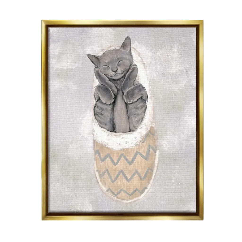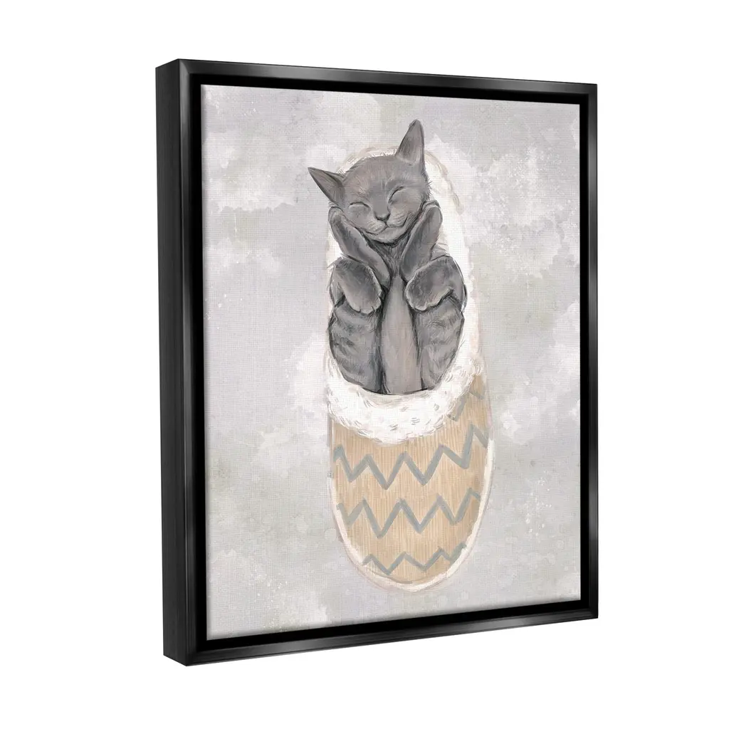 Elevate your home or office to the next level with Stupell Framed Floating Canvas Wall Art. Our premium hand-stretched canvas is mounted securely into a sturdy lightweight frame. The museum-style gap between the wrapped canvas and the box frame gives the illusion of floating artwork. Stupell Wall Art is made in the USA.Features: Dimensions: 17 x 1.7 x 21 Frame, 16 x 1.5 x 20 Canvas ArtFloating Frame Canvas Products are available in sizes 17"x21" and 25"x31". All Floating Frame Canvas Products have a 1.7" Depth.Wall Art is Ready to Hang with Hardware Free Hanging. No Installation required. For Easy Set Up Lean or Layer Artwork on Shelf or Against Wall. Artwork is Permently Fixed into the Frame.Our elevated 1.7" Thick Floating Frame is the perfect complement to our canvas style Wall Art. We use only the highest quality inks in house with industry leading printing solutions. Canvas is hand stretched over a durable wood foundation and then mounted securly into a Modern Box Frame. Made in the USA.Artwork Relates To: Animal, Pet, Cat, Kitten, Slipper, Cozy, Rest, Relax, SleepDesign by Ziwei Li