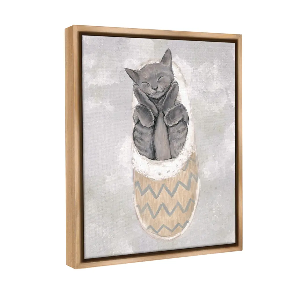Elevate your home or office to the next level with Stupell Framed Floating Canvas Wall Art. Our premium hand-stretched canvas is mounted securely into a sturdy lightweight frame. The museum-style gap between the wrapped canvas and the box frame gives the illusion of floating artwork. Stupell Wall Art is made in the USA.Features: Dimensions: 17 x 1.7 x 21 Frame, 16 x 1.5 x 20 Canvas ArtFloating Frame Canvas Products are available in sizes 17"x21" and 25"x31". All Floating Frame Canvas Products have a 1.7" Depth.Wall Art is Ready to Hang with Hardware Free Hanging. No Installation required. For Easy Set Up Lean or Layer Artwork on Shelf or Against Wall. Artwork is Permently Fixed into the Frame.Our elevated 1.7" Thick Floating Frame is the perfect complement to our canvas style Wall Art. We use only the highest quality inks in house with industry leading printing solutions. Canvas is hand stretched over a durable wood foundation and then mounted securly into a Modern Box Frame. Made in the USA.Artwork Relates To: Animal, Pet, Cat, Kitten, Slipper, Cozy, Rest, Relax, SleepDesign by Ziwei Li