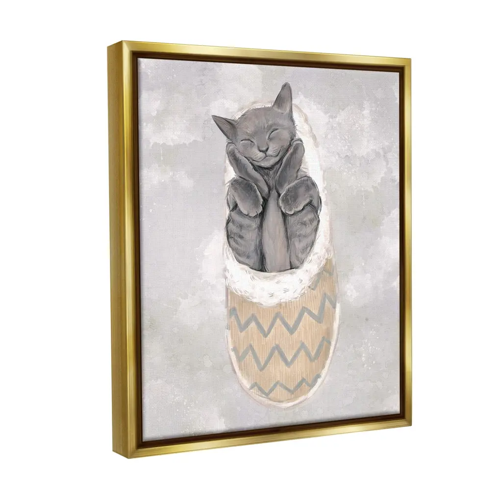 Elevate your home or office to the next level with Stupell Framed Floating Canvas Wall Art. Our premium hand-stretched canvas is mounted securely into a sturdy lightweight frame. The museum-style gap between the wrapped canvas and the box frame gives the illusion of floating artwork. Stupell Wall Art is made in the USA.Features: Dimensions: 17 x 1.7 x 21 Frame, 16 x 1.5 x 20 Canvas ArtFloating Frame Canvas Products are available in sizes 17"x21" and 25"x31". All Floating Frame Canvas Products have a 1.7" Depth.Wall Art is Ready to Hang with Hardware Free Hanging. No Installation required. For Easy Set Up Lean or Layer Artwork on Shelf or Against Wall. Artwork is Permently Fixed into the Frame.Our elevated 1.7" Thick Floating Frame is the perfect complement to our canvas style Wall Art. We use only the highest quality inks in house with industry leading printing solutions. Canvas is hand stretched over a durable wood foundation and then mounted securly into a Modern Box Frame. Made in the USA.Artwork Relates To: Animal, Pet, Cat, Kitten, Slipper, Cozy, Rest, Relax, SleepDesign by Ziwei Li